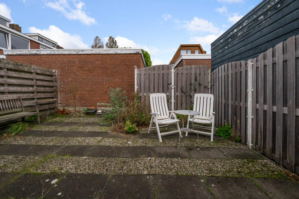In de aanbouw aan de achterzijde bevindt zich de bijkeuken met de aansluiting voor de wasmachine, vanuit hier stap je direct de achtertuin in, een zonnige plek op het westen met volop mogelijkheden voor een terras of een groene hoek. Achterin de tuin staat een houten berging voor fietsen en tuingereedschap. Daarnaast is de badkamer ook op de begane grond te vinden.