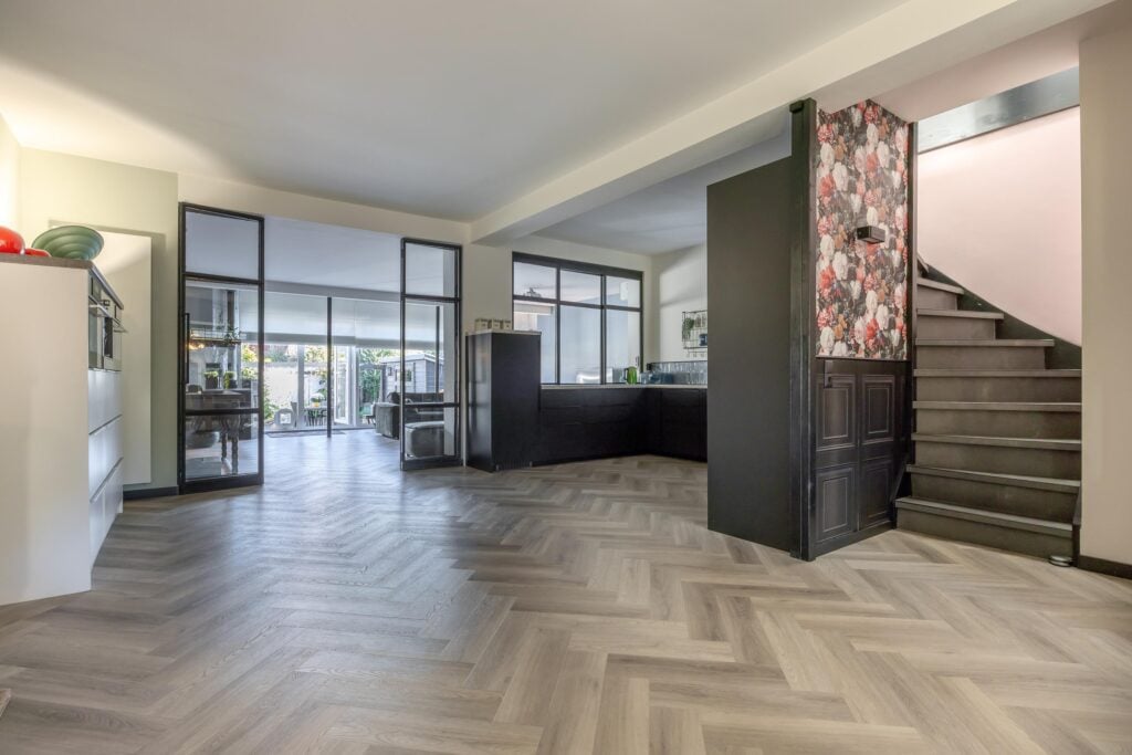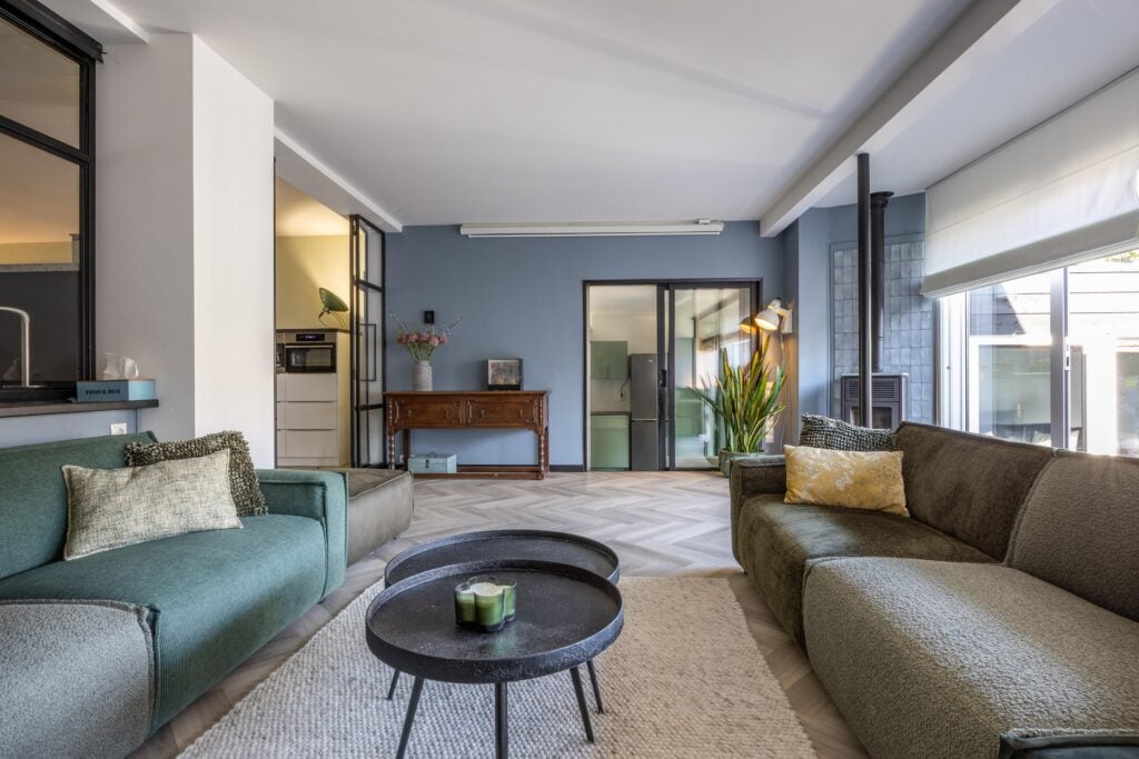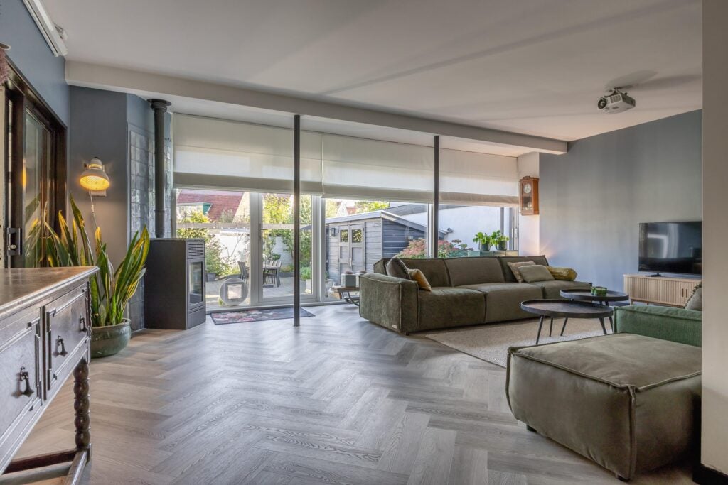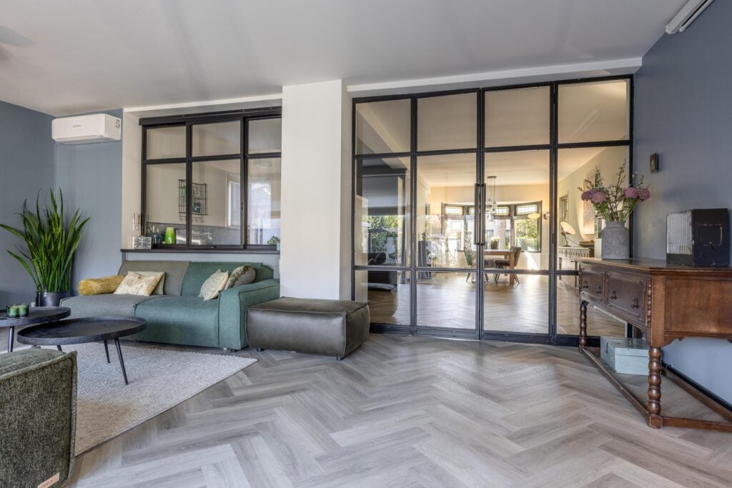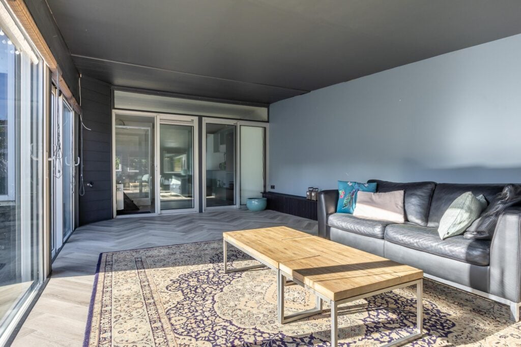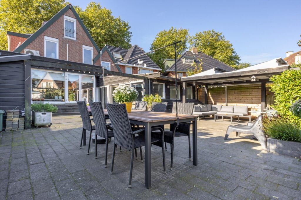 De moderne hoekkeuken is van alle gemakken voorzien, waaronder een koelkast, vaatwasser, inductiekookplaat, combi- en stoomoven, koffiemachine en volop kastruimte. Een stijlvolle roomdivider met stalen openslaande deuren leidt je naar het uitgebouwde gedeelte van de woning. Hier vind je een royale zitkamer met airconditioning en toegang tot de bijkeuken met douche en wasruimte. Vanuit dit deel van de woning stap je de lichte serre in, die uitkijkt op de tuin en waar je ’s avonds heerlijk kunt ontspannen.