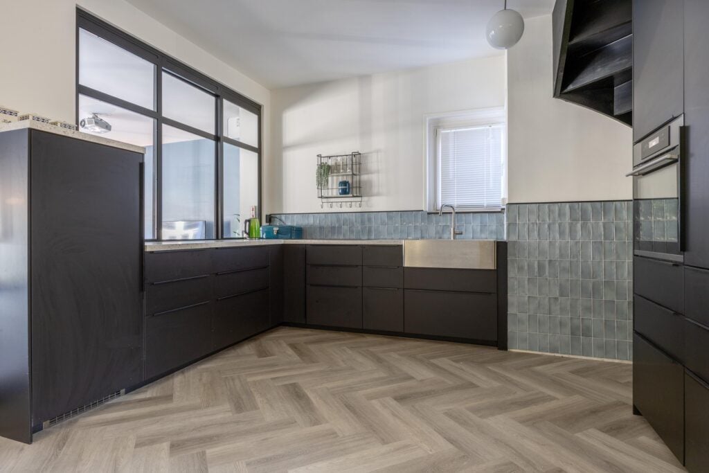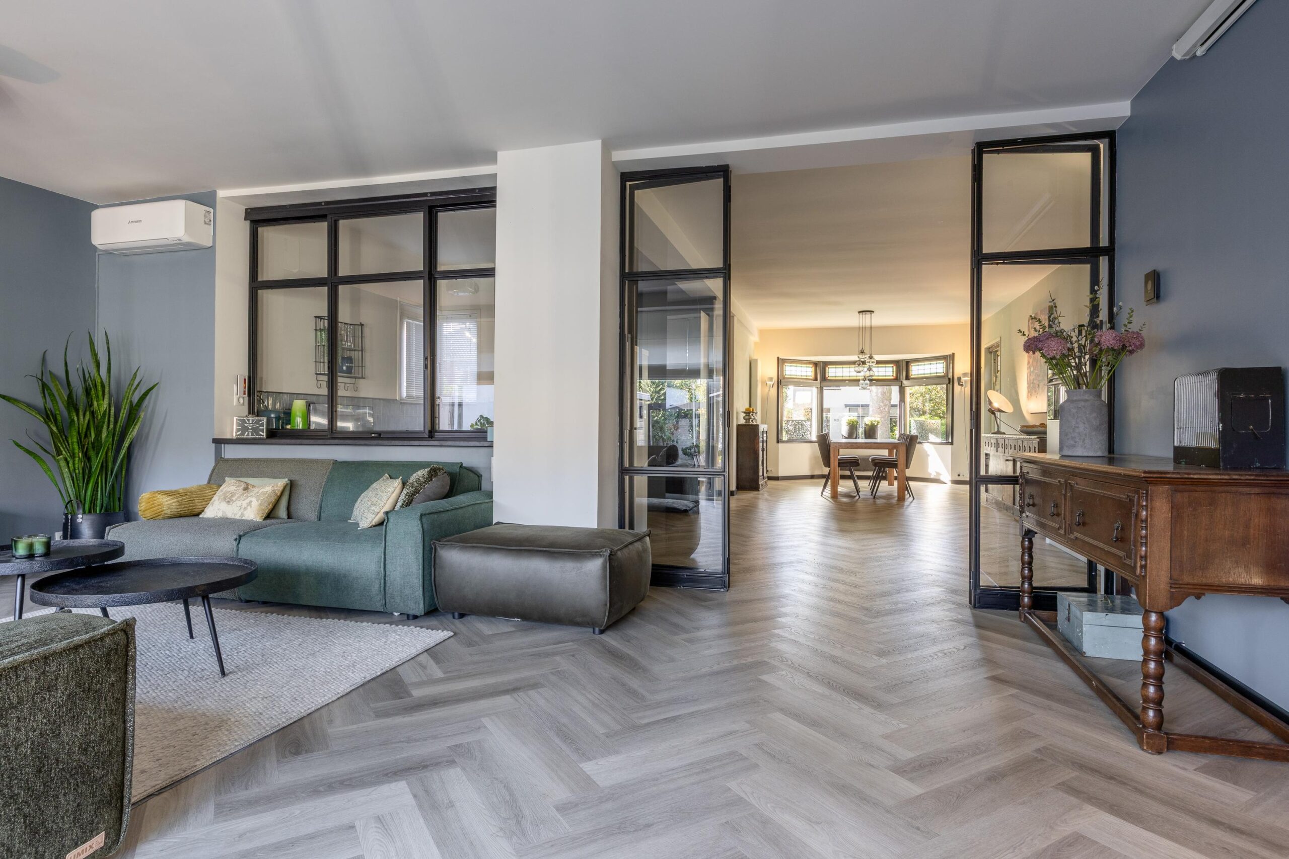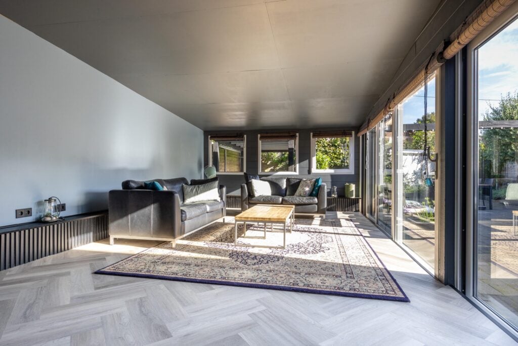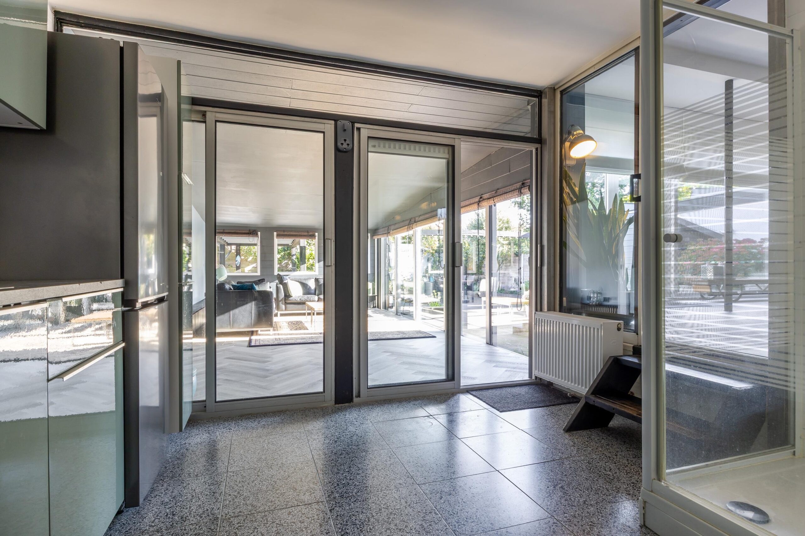 De moderne hoekkeuken is van alle gemakken voorzien, waaronder een koelkast, vaatwasser, inductiekookplaat, combi- en stoomoven, koffiemachine en volop kastruimte. Een stijlvolle roomdivider met stalen openslaande deuren leidt je naar het uitgebouwde gedeelte van de woning. Hier vind je een royale zitkamer met airconditioning en toegang tot de bijkeuken met douche en wasruimte. Vanuit dit deel van de woning stap je de lichte serre in, die uitkijkt op de tuin en waar je ’s avonds heerlijk kunt ontspannen.