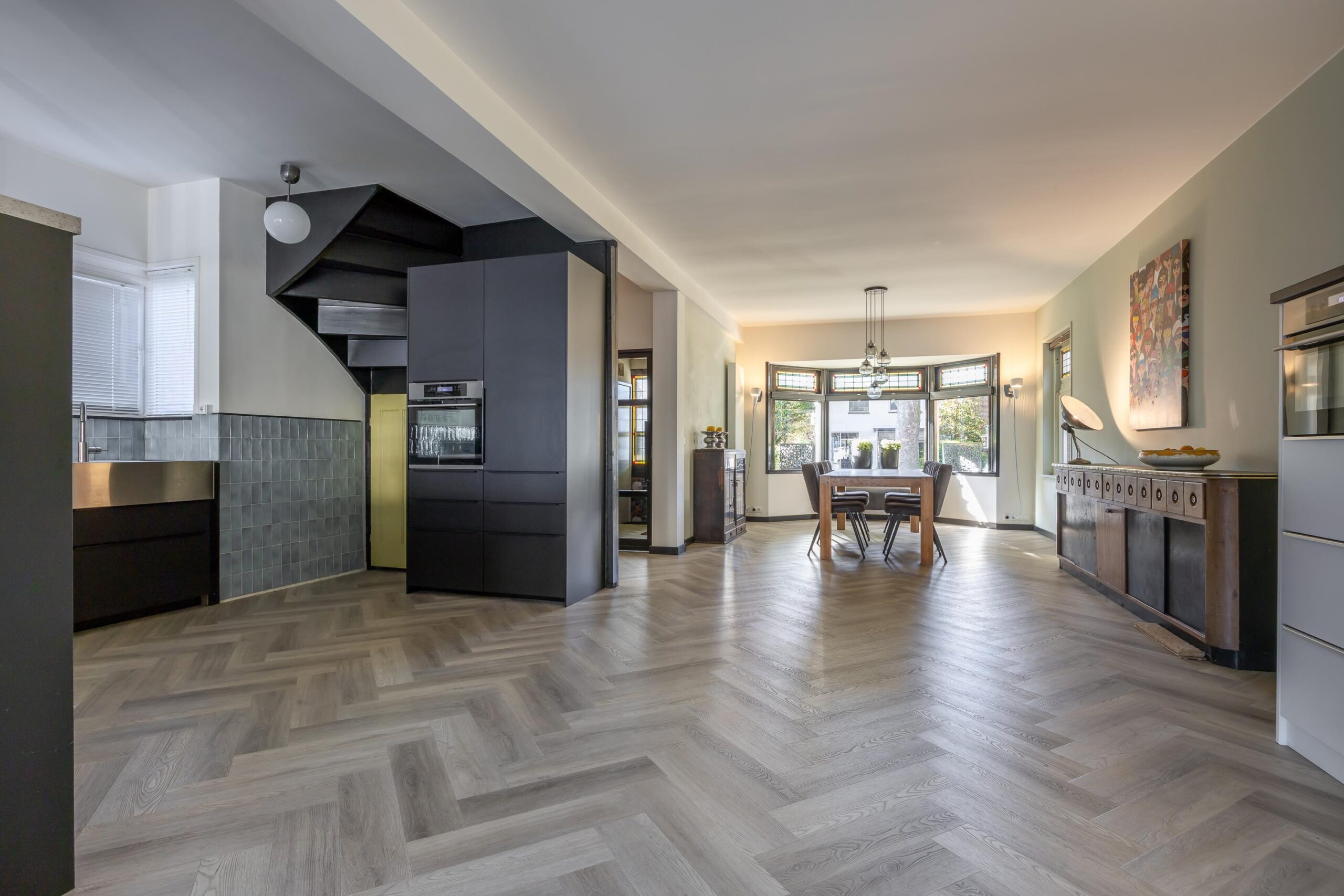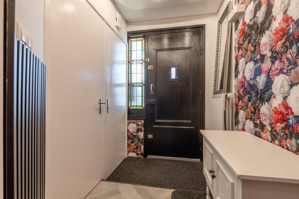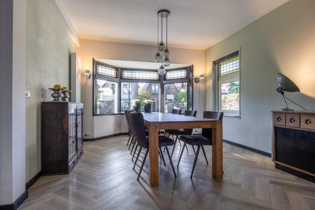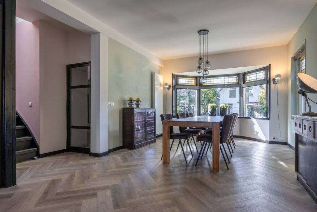 Zodra je binnenkomt, voel je direct de charme van de woning dankzij de originele voordeur en het glas-in-lood. Via de hal met toilet en fonteintje betreed je de sfeervolle woonkamer. Deze is strak gestuct, heeft een erker met glas-in-lood en is afgewerkt met een fraaie visgraatvloer voorzien van vloerverwarming.