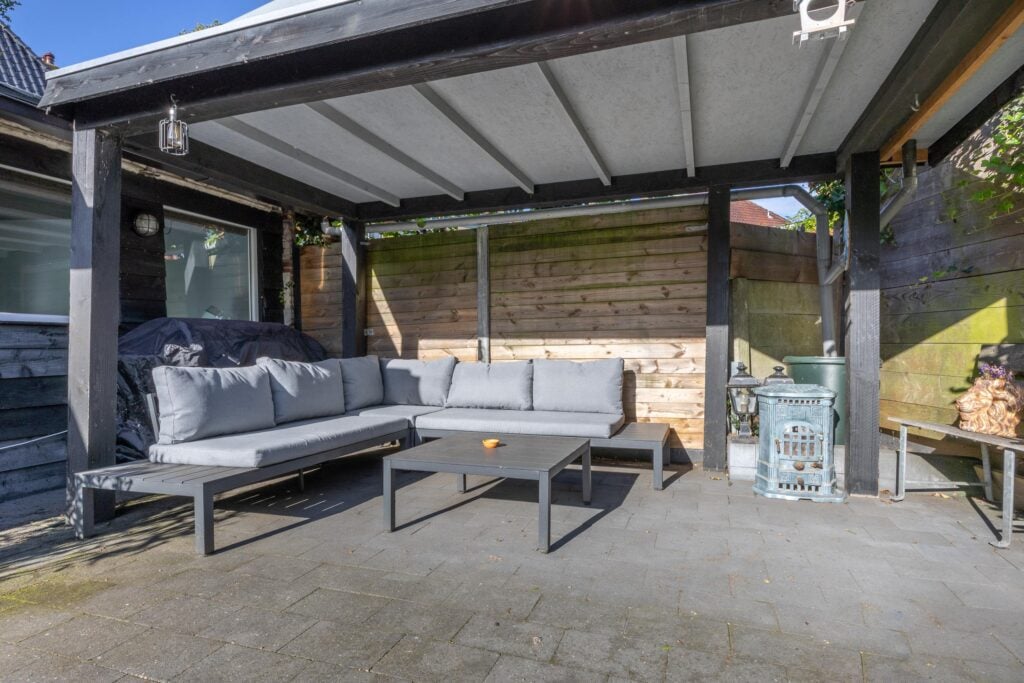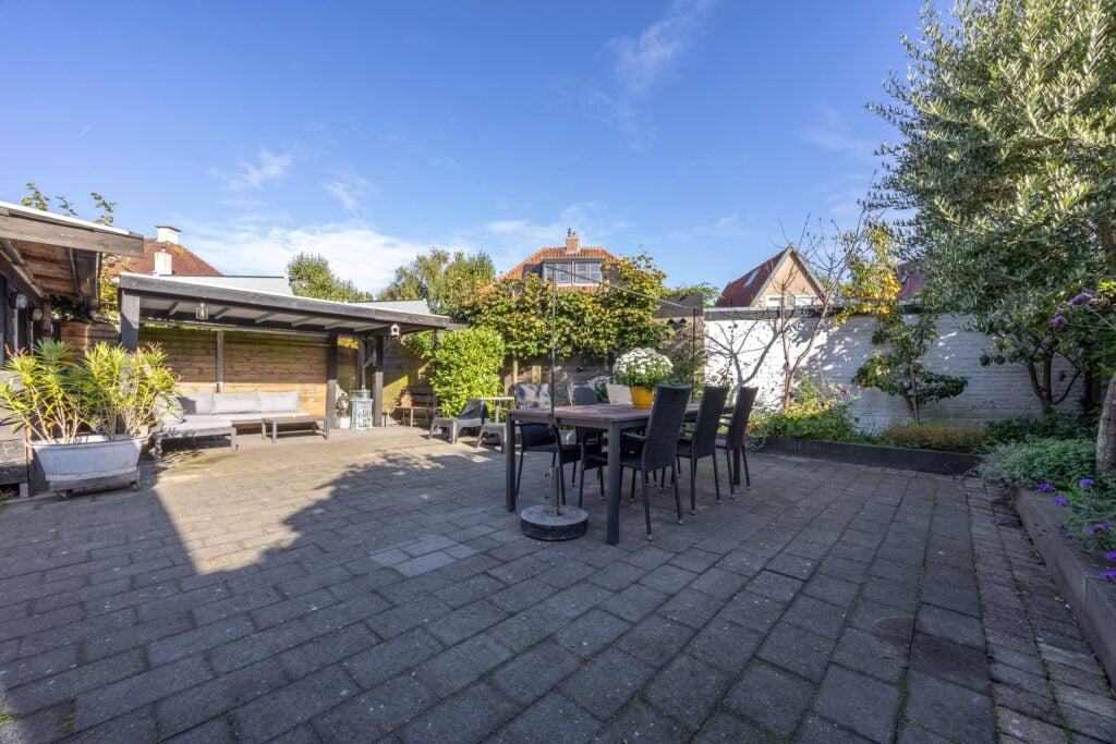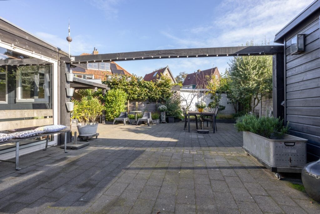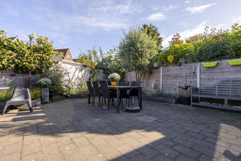 De achtertuin is royaal opgezet en beschikt over een berging en een overkapping. Dankzij de diepte en de breedte van de tuin kun je de hele dag door genieten van de zon.