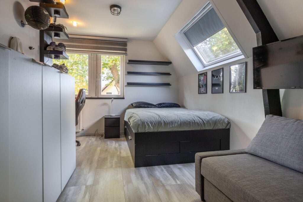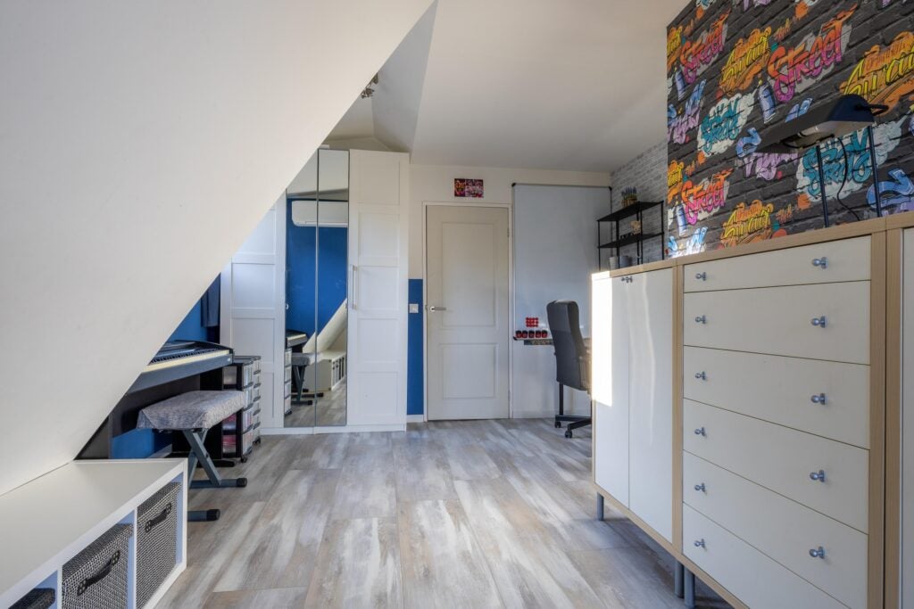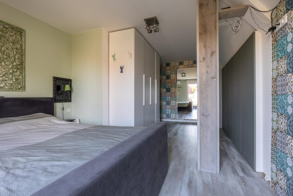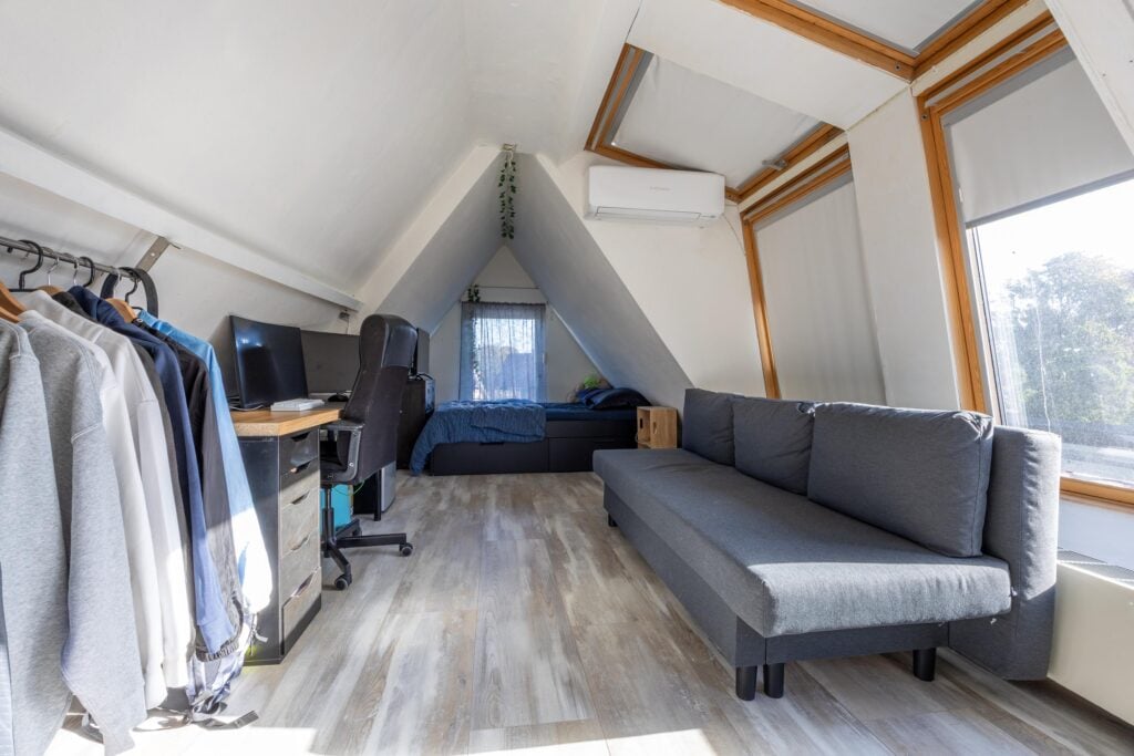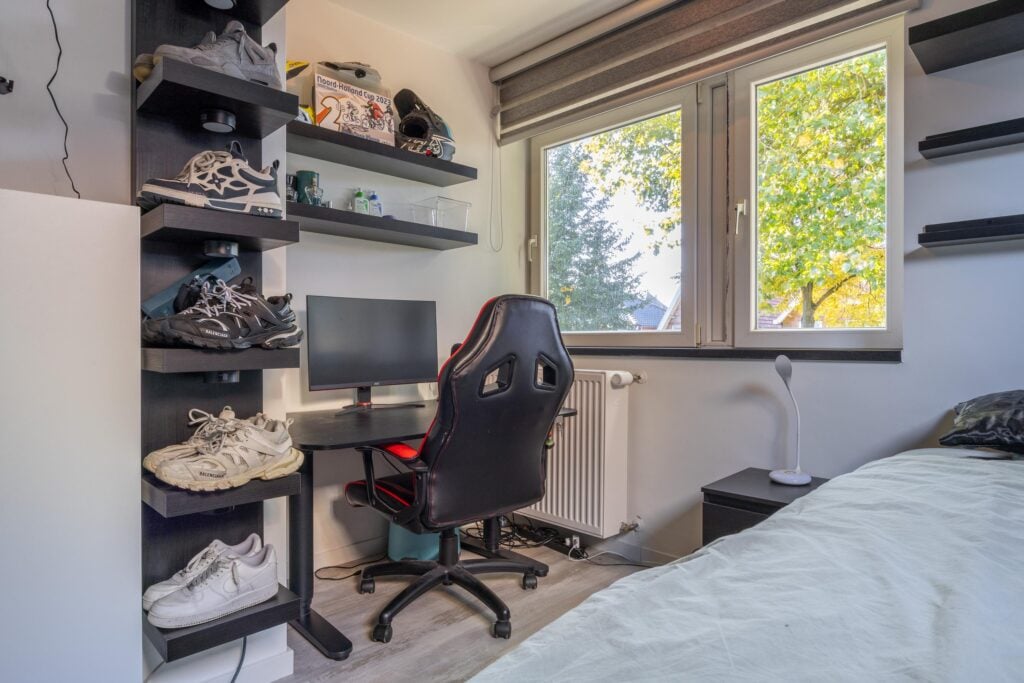 Overloop met voorzolder en stookruimte. Daarnaast een ruime slaapkamer met veel bergruimte, uitgerust met een Velux dakkapelserre en eveneens een airconditioning. Op het dak van de woning liggen bovendien 5 zonnepanelen en nog eens 4 op het dak van de overkapping, wat bijdraagt aan lagere energielasten.