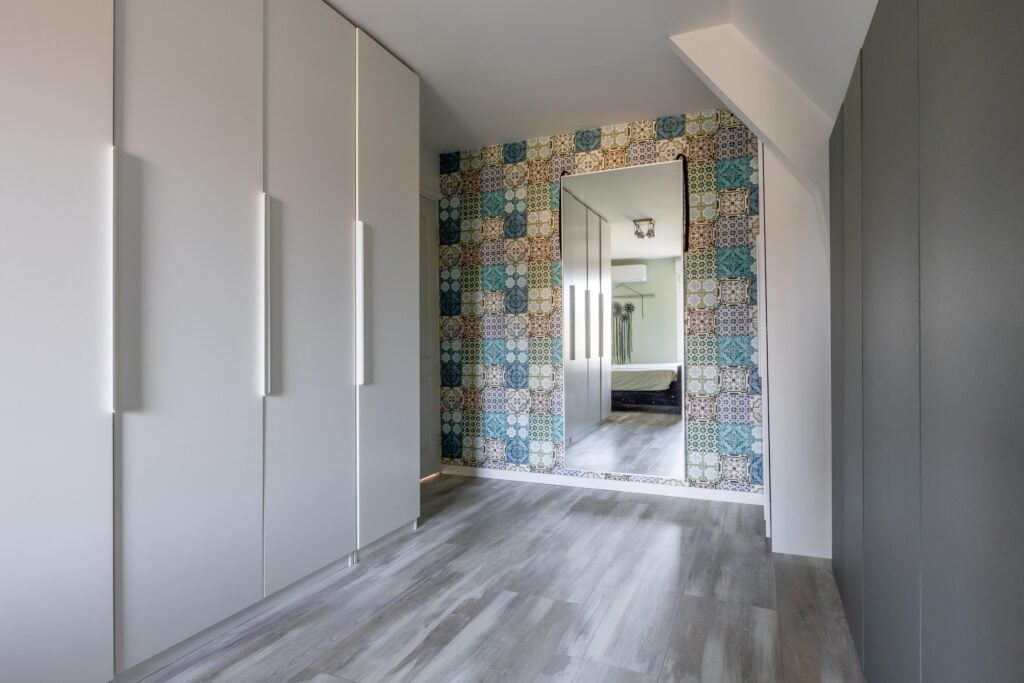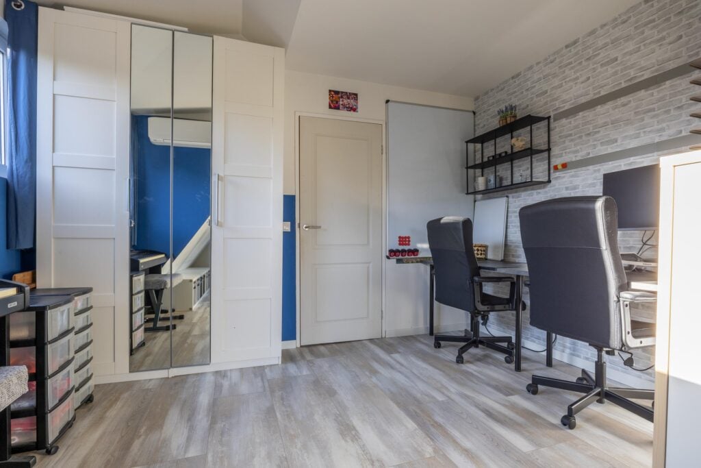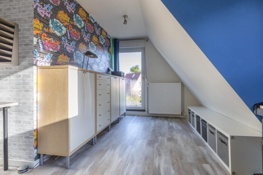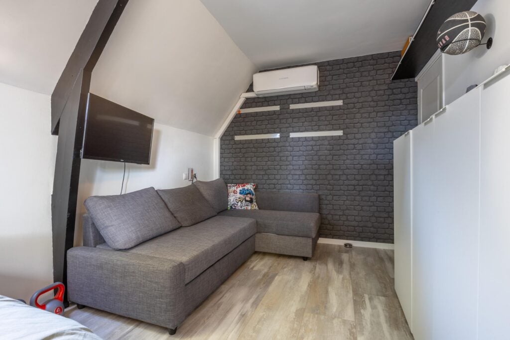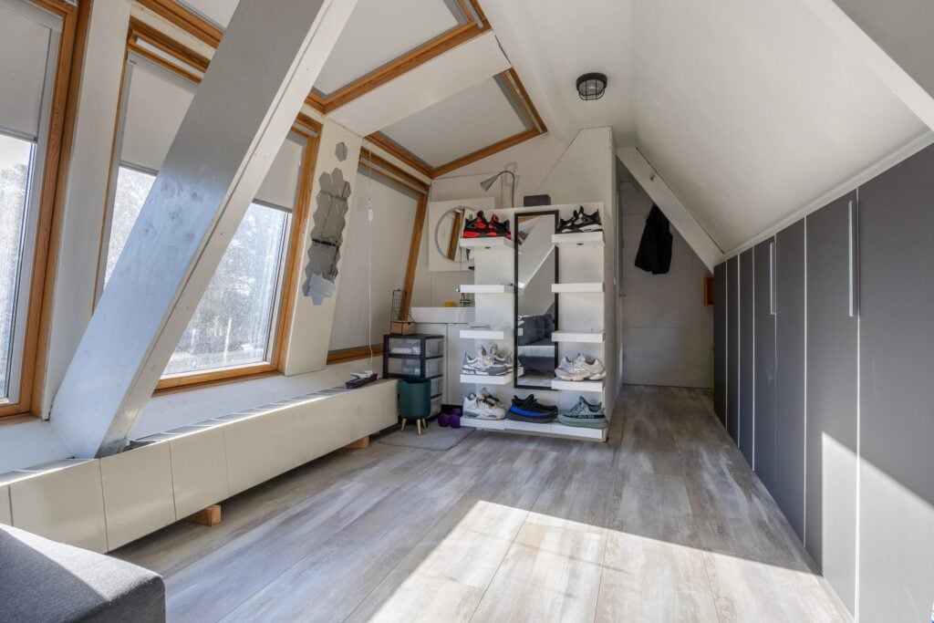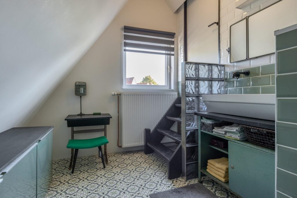 Overloop met voorzolder en stookruimte. Daarnaast een ruime slaapkamer met veel bergruimte, uitgerust met een Velux dakkapelserre en eveneens een airconditioning. Op het dak van de woning liggen bovendien 5 zonnepanelen en nog eens 4 op het dak van de overkapping, wat bijdraagt aan lagere energielasten.