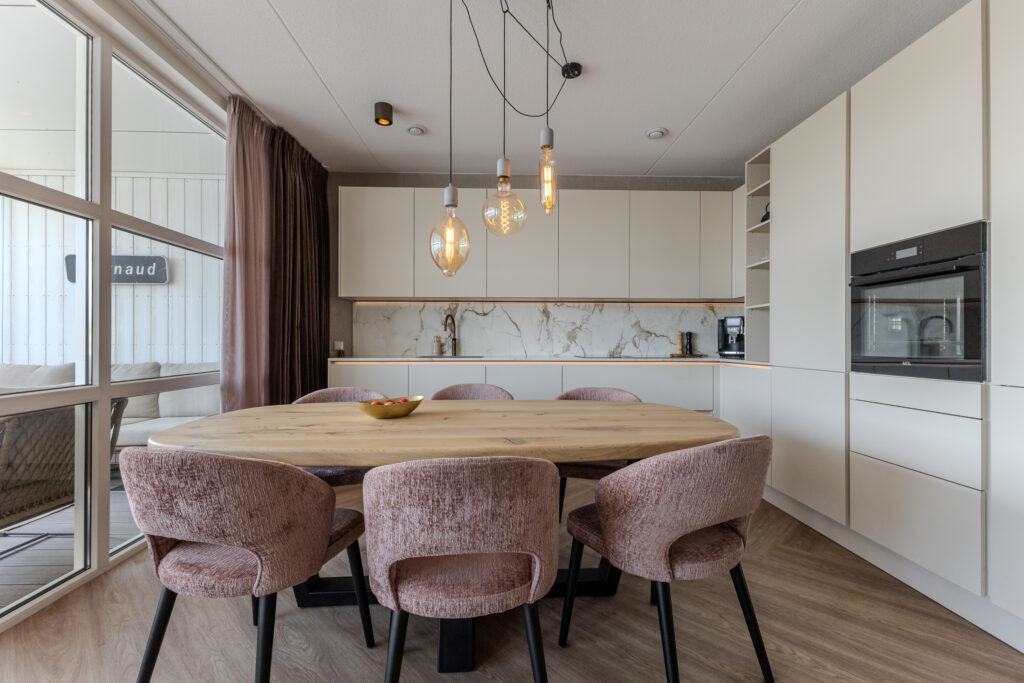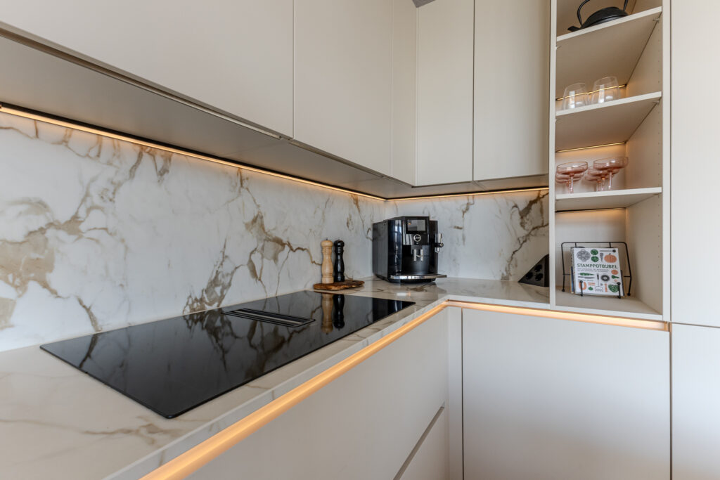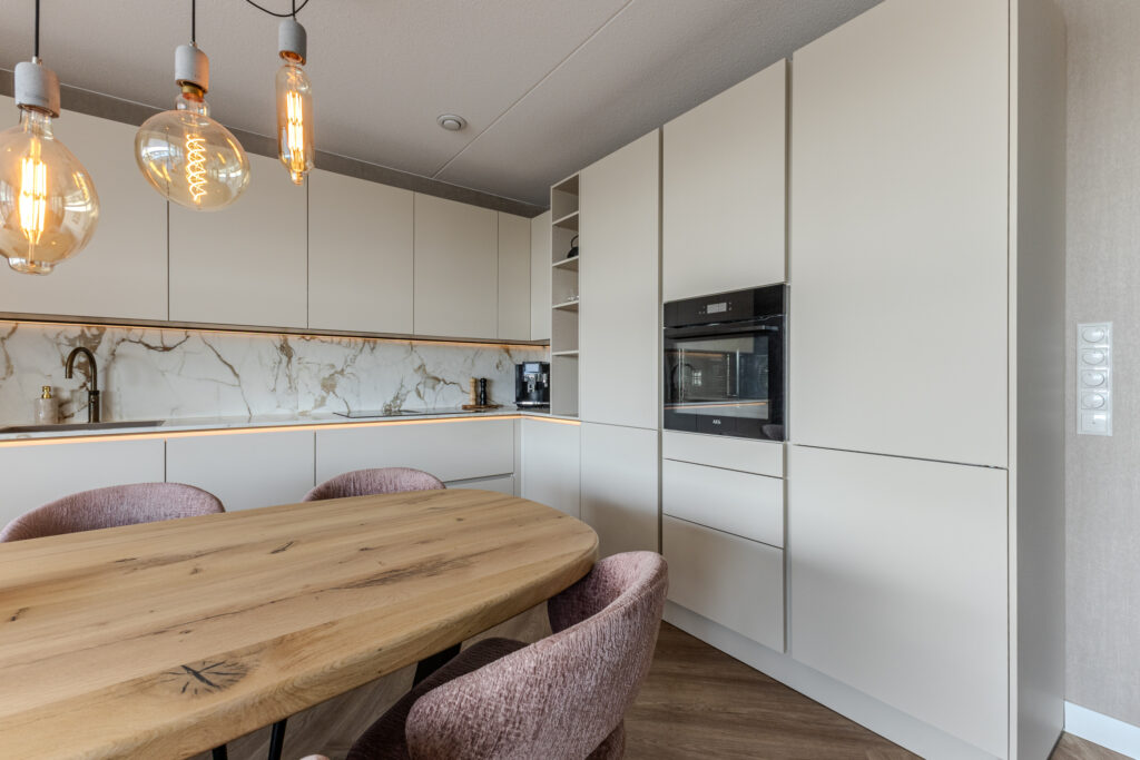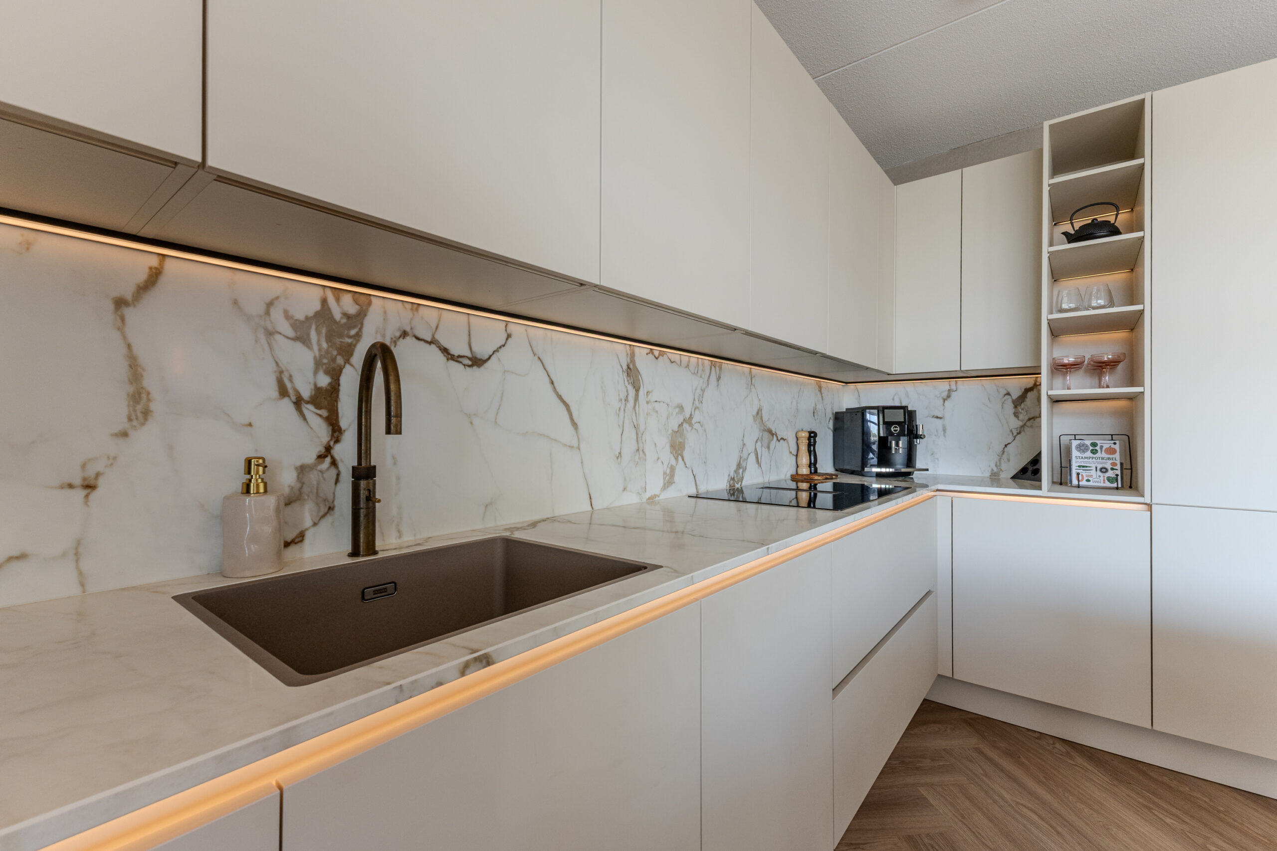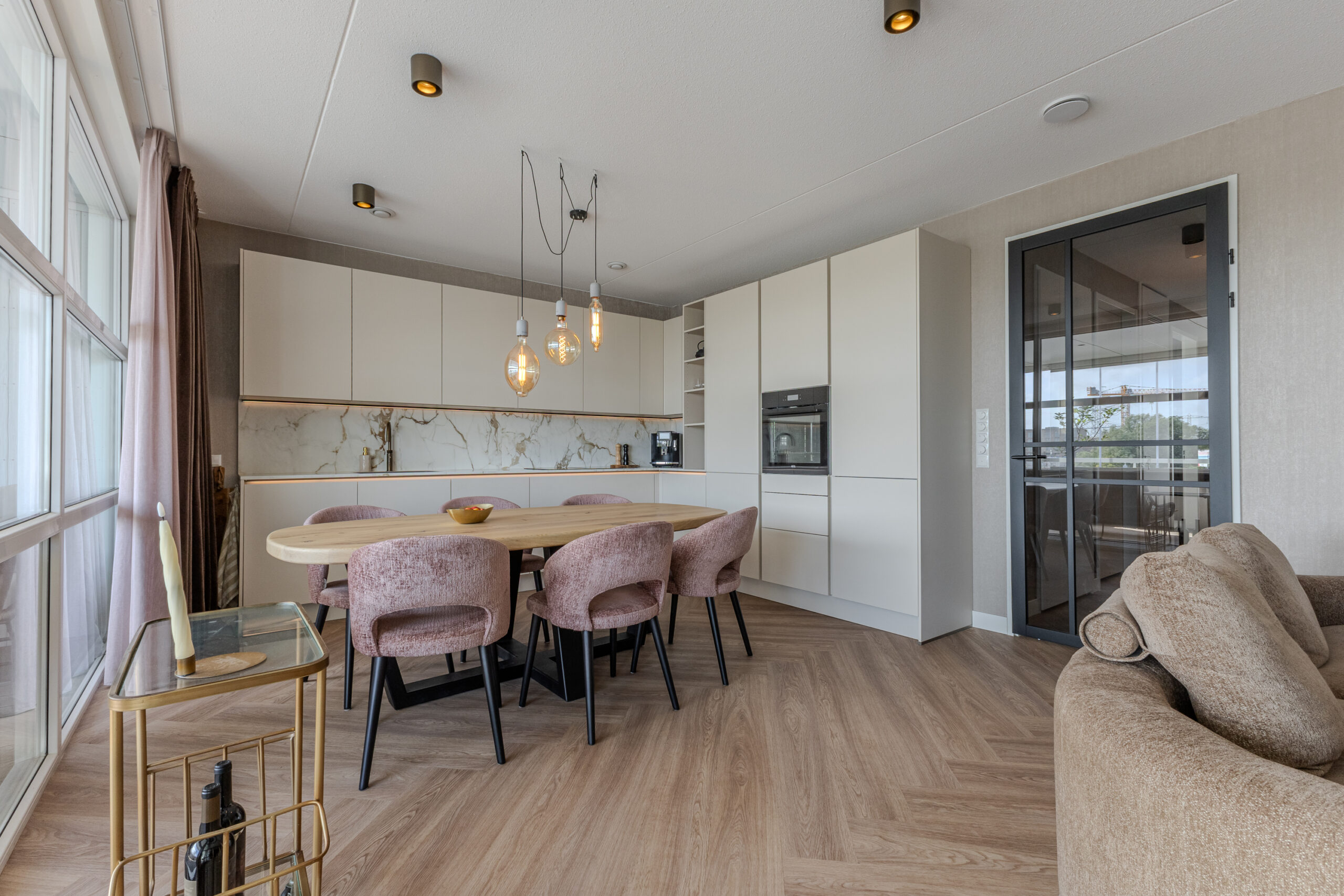 Aan de Zuideinde 80E in Koog aan de Zaan ervaar je comfort vanaf het eerste moment. De doorlopende pvc-vloer in visgraat legt de basis voor een strak geheel. De woonkamer ligt aan de achterzijde en staat in direct contact met het uitzicht dankzij de glazen achterwand en het metershoge plafond. Aan de ene kant creëer je een knusse zithoek, aan de andere kant kook je in de open keuken. Dit is echt een eyecatcher! De droomkeuken van iedereen met oog voor detail en kijk op klasse. Over comfort is nagedacht: vloerverwarming en koeling door het hele appartement en een energiezuinige warmtepomp.