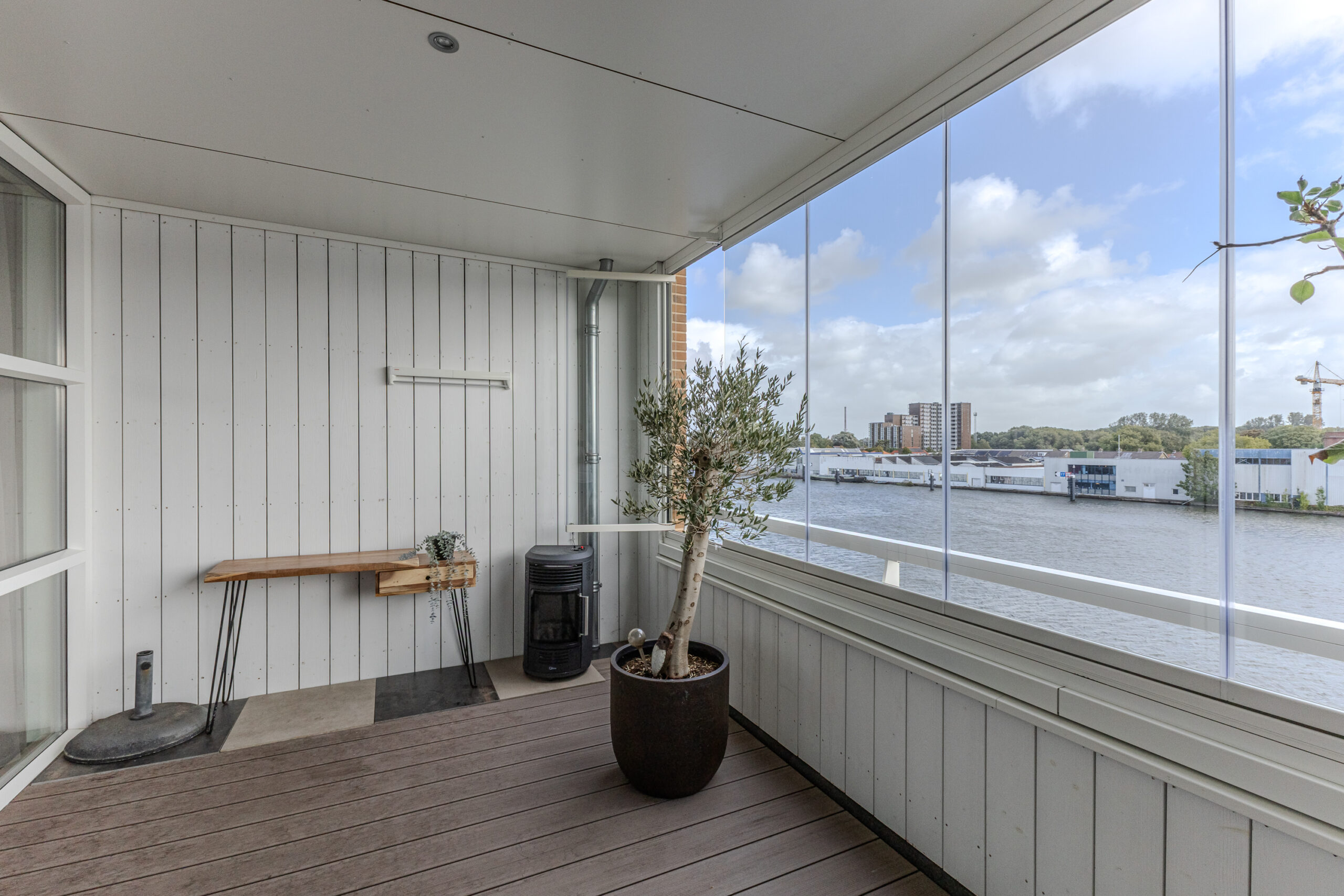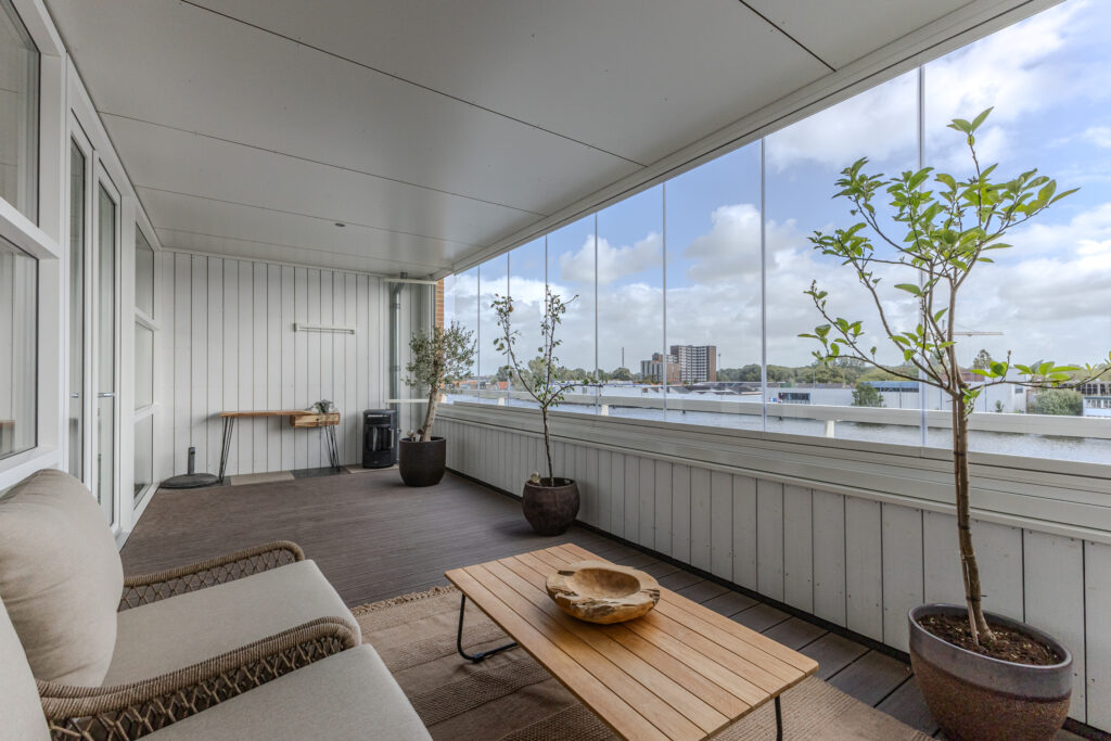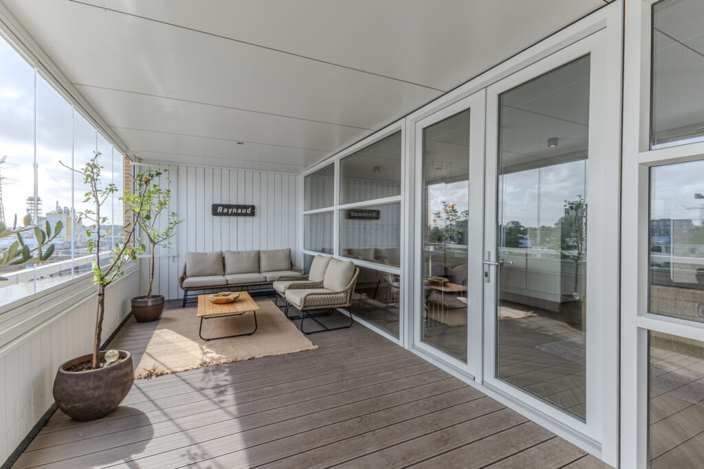Via kunststof openslaande deuren stap je de loggia op: een overdekte buitenruimte met spotjes en pelletkachel, zodat je hier meerdere seizoenen, ook ’s avonds, heerlijk zit en van de Zaanse omgeving geniet.
