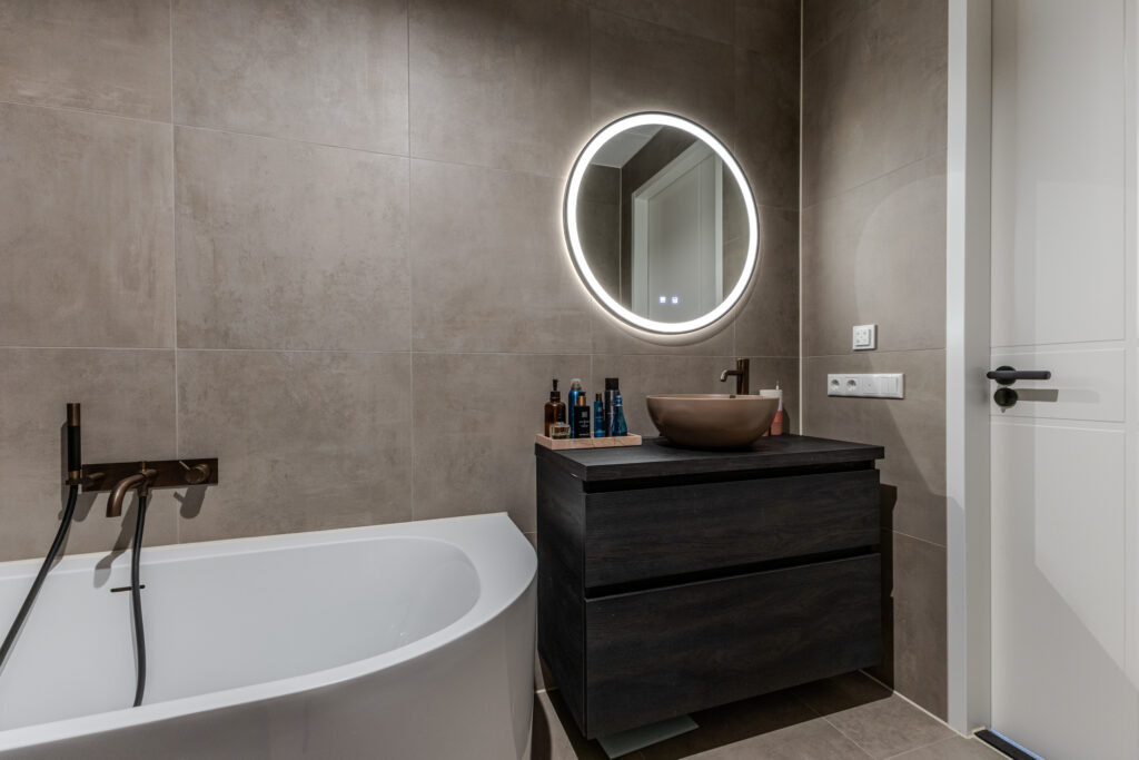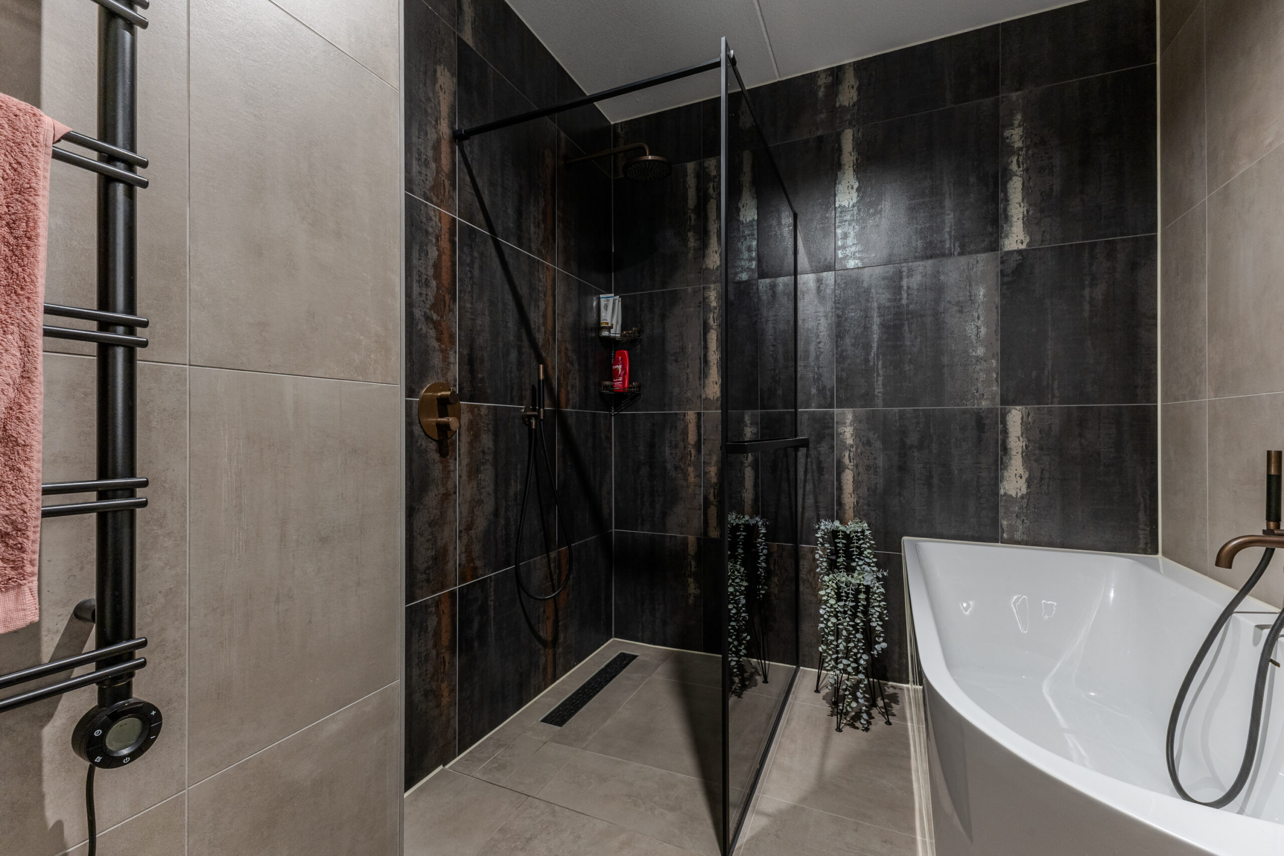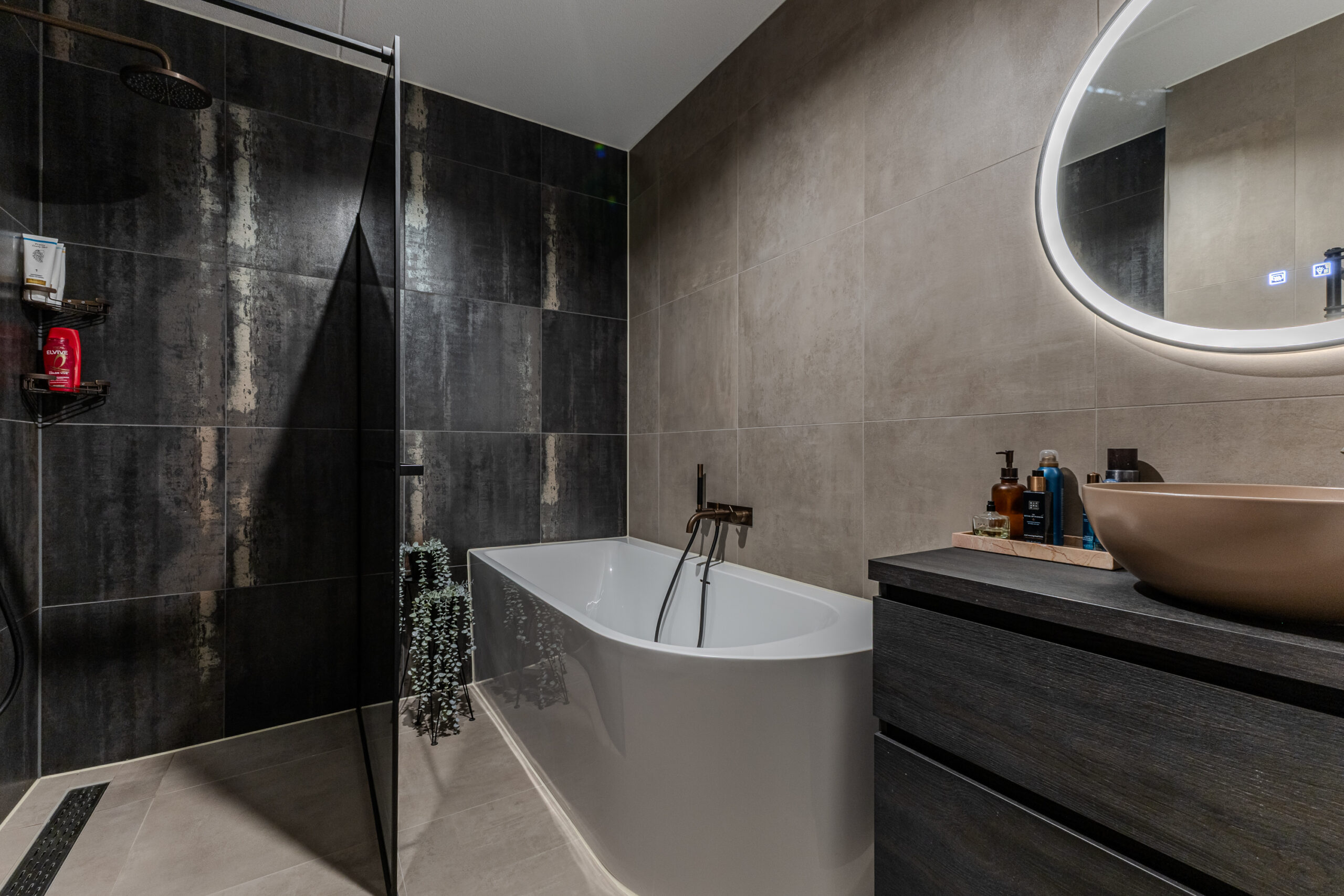 De badkamer heeft een stoere, strakke uitstraling met regendouche, ligbad, wastafelmeubel, handdoekradiator en natuurlijk vloerverwarming. Het sanitair is in één bijpassende stijl uitgevoerd.