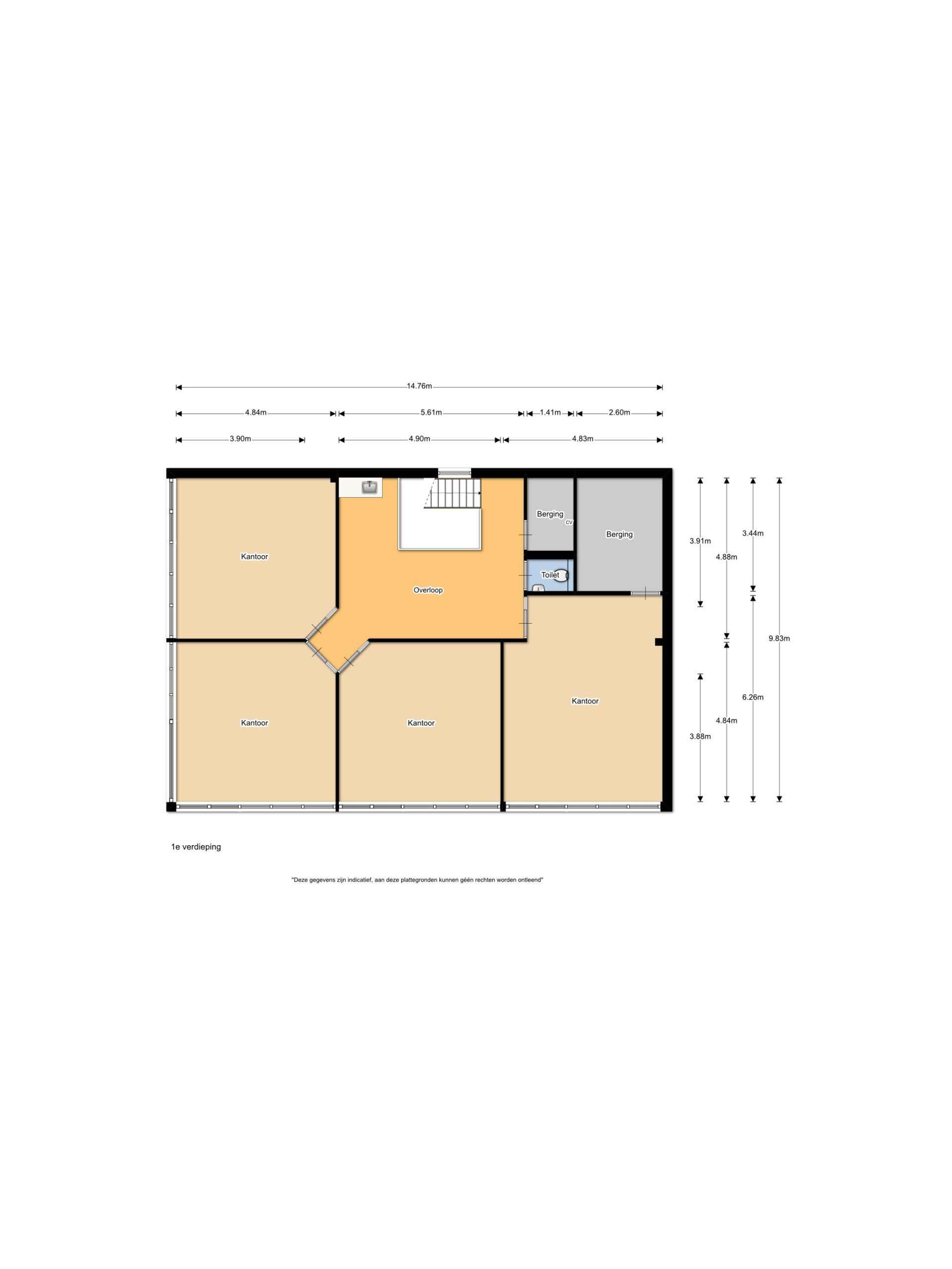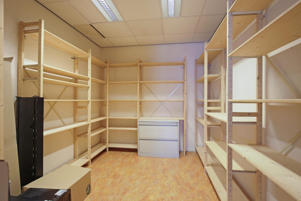 1e verdieping: overloop, toilet, stookhok, archiefruimte en 3 kantoorkamers.