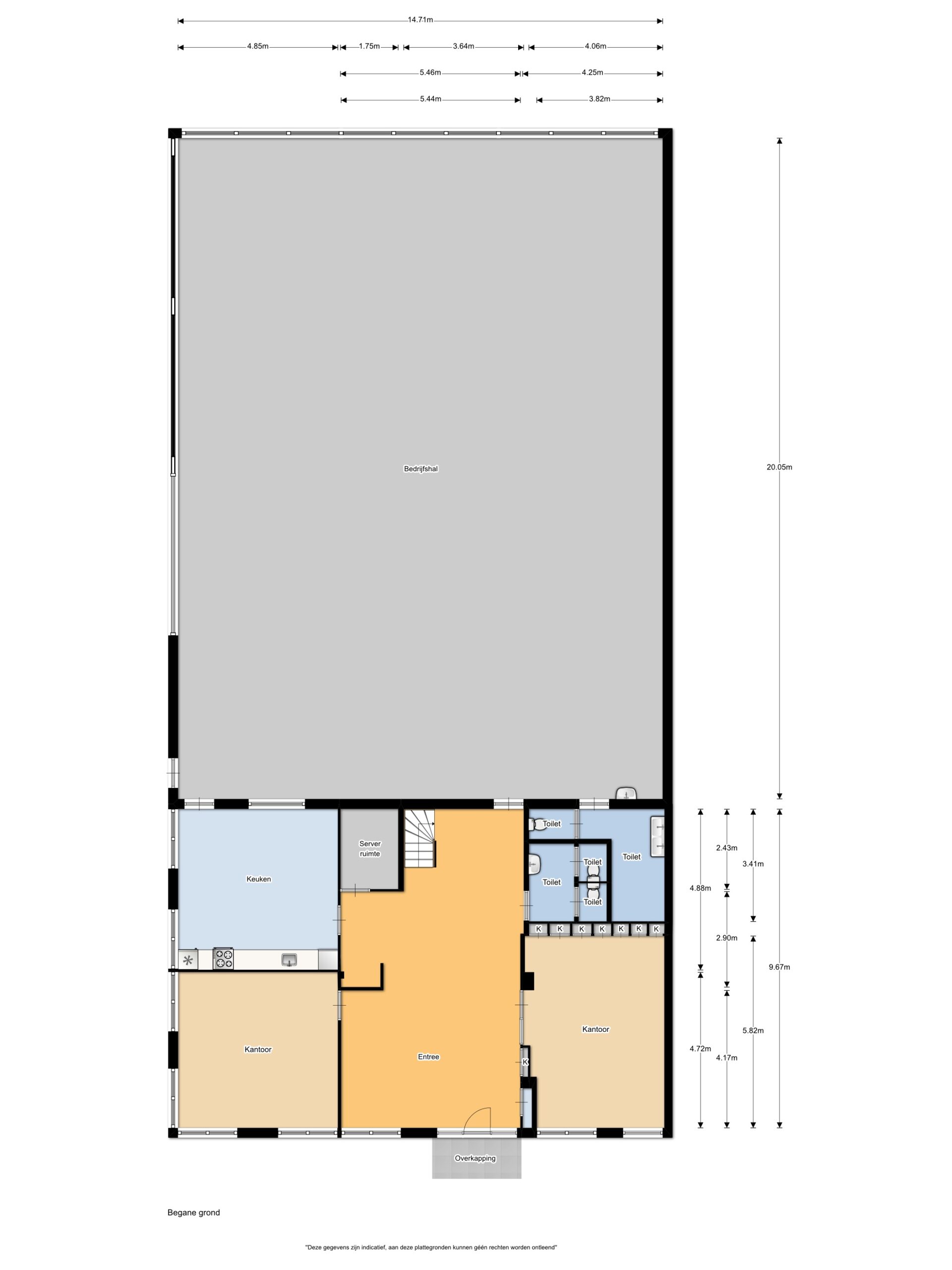 Entree, royale hal, diverse kantoorkamers, toiletgroep, patchkastruimte, kantine, toegang tot de bedrijfsruimte met wasgelegenheid en toilet/urinoir.
