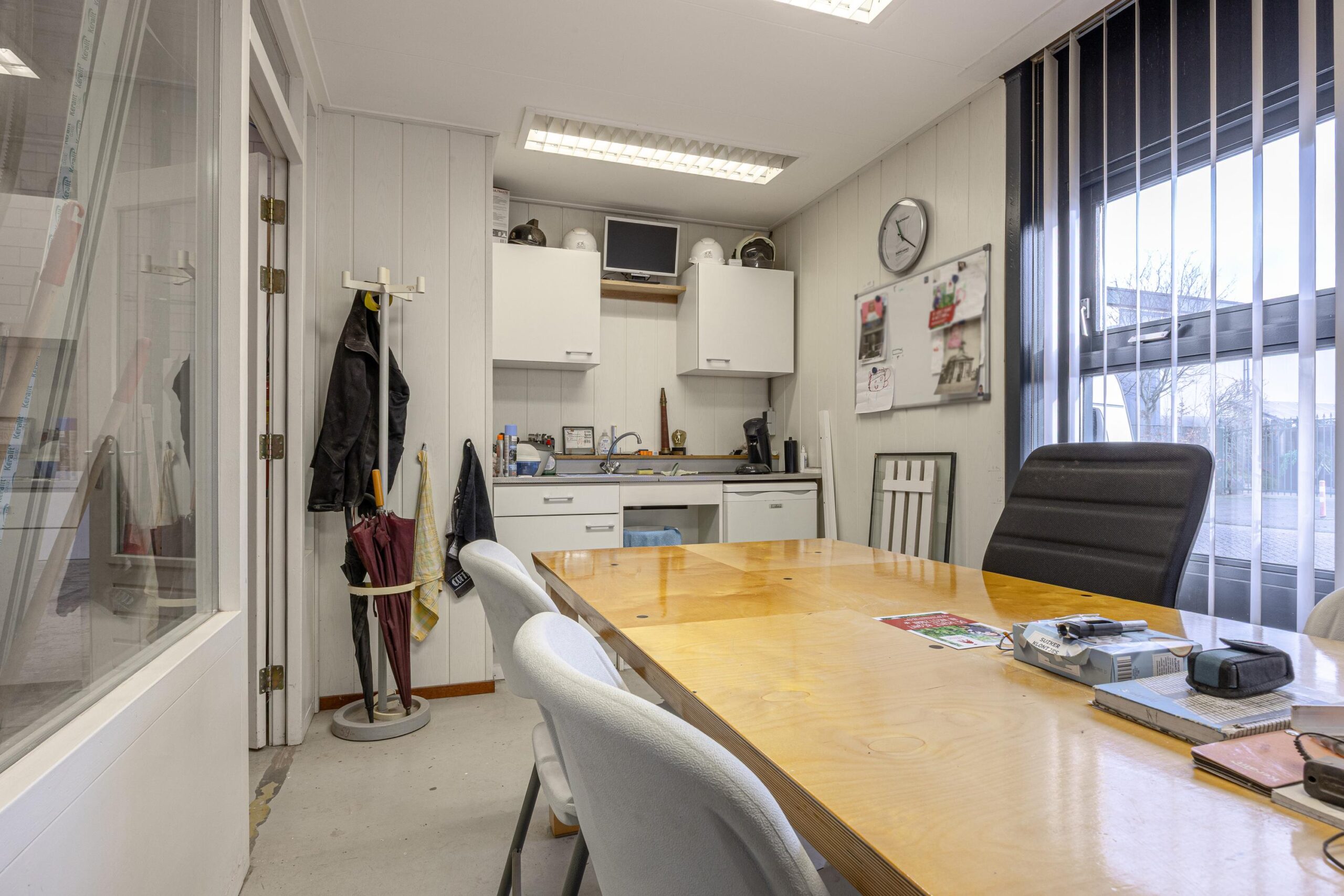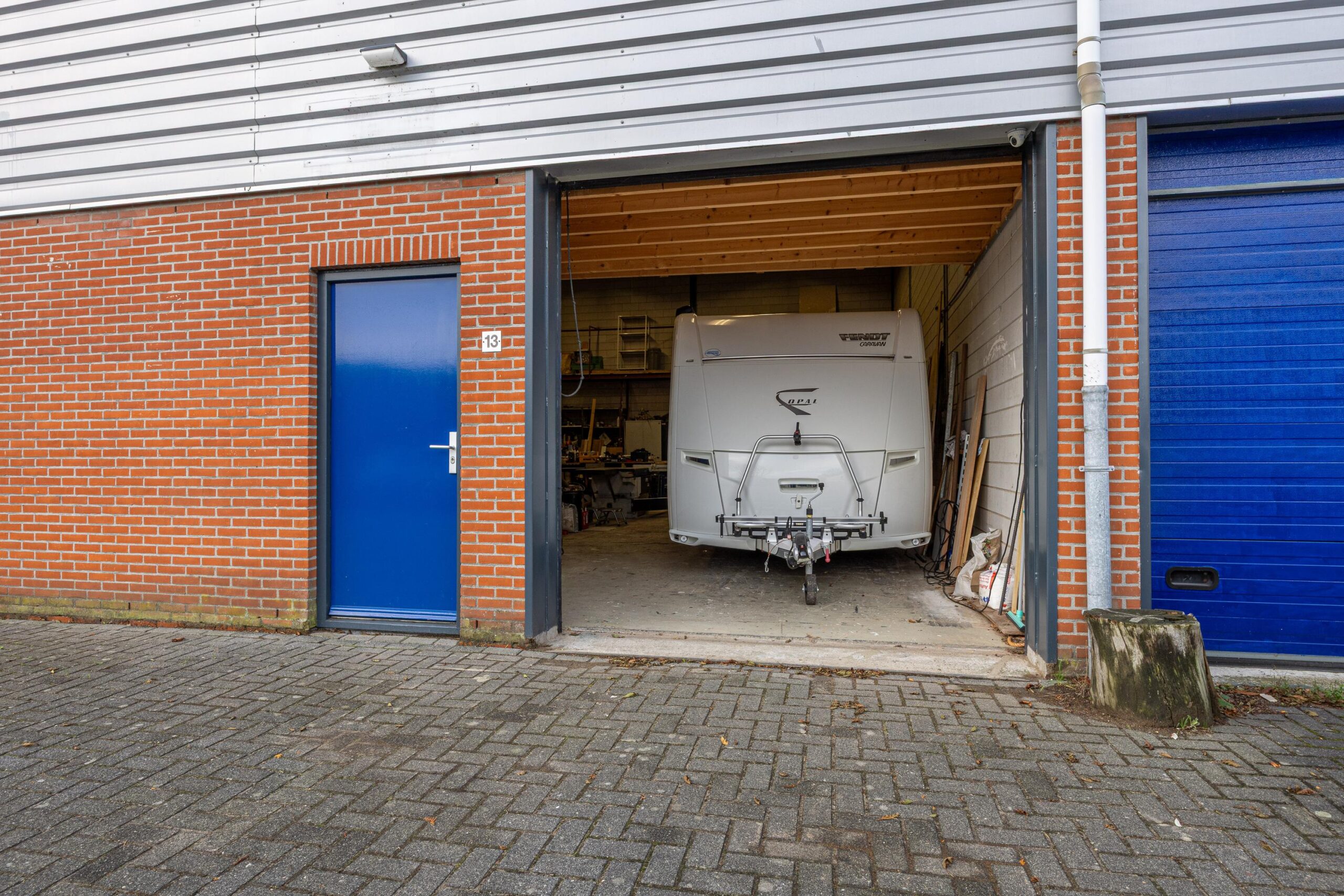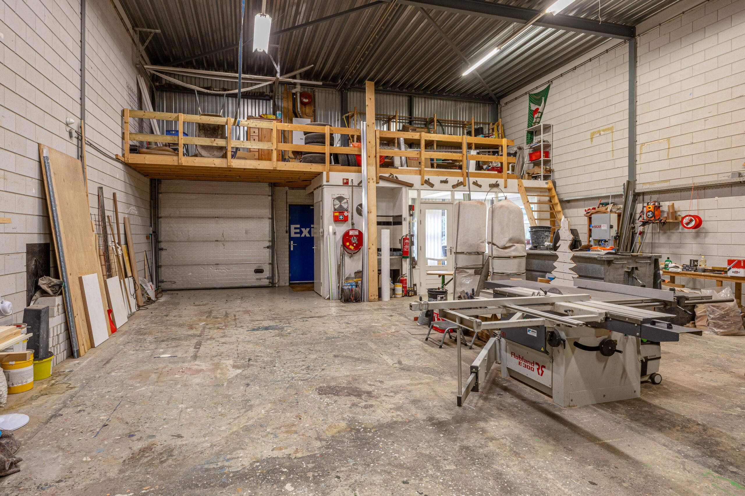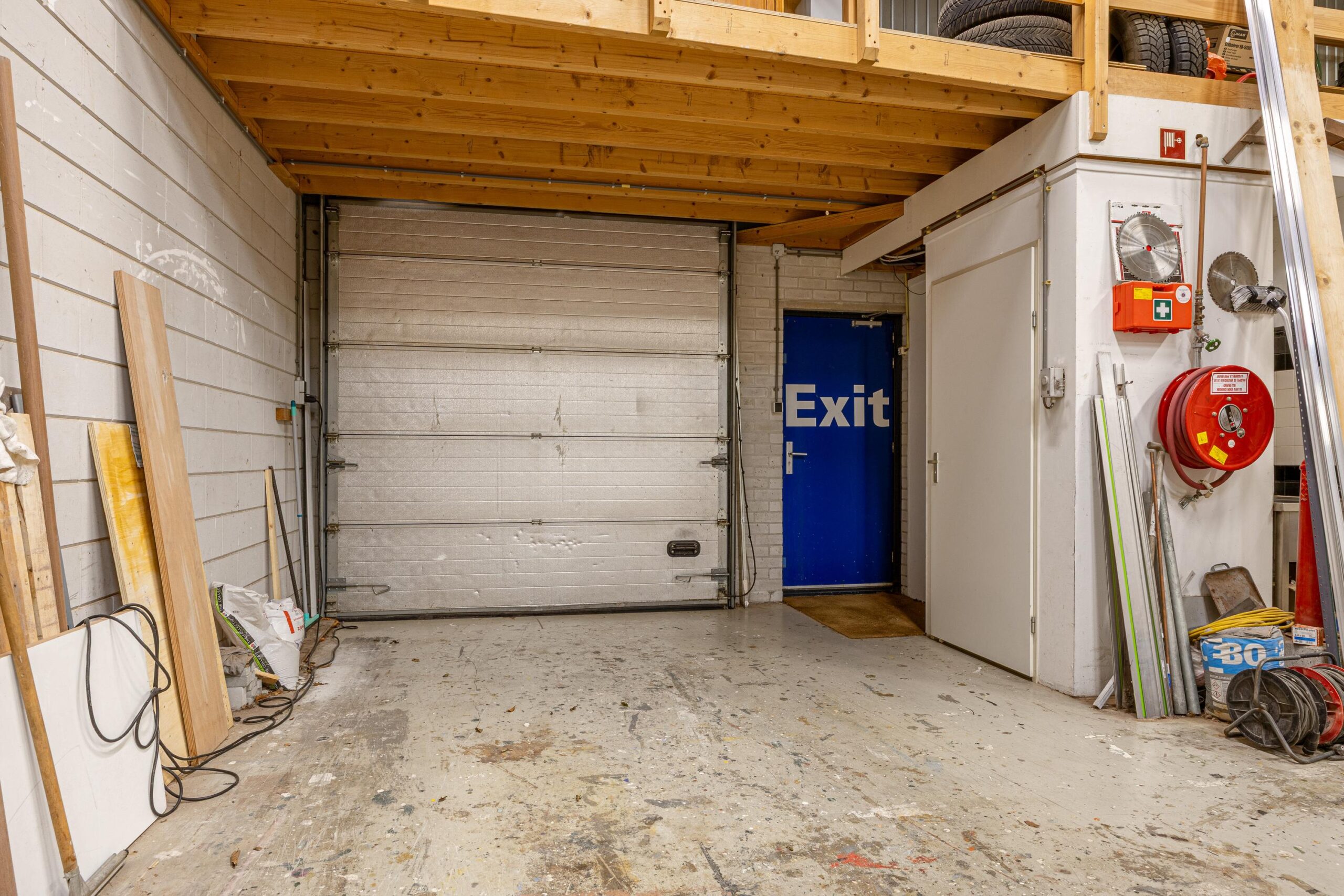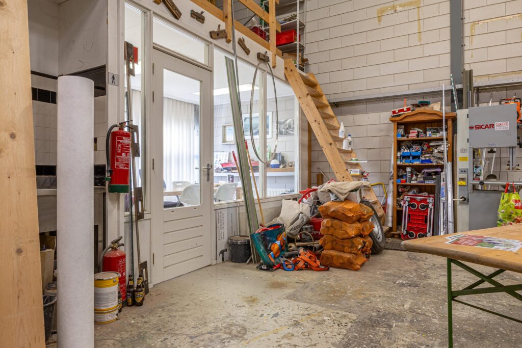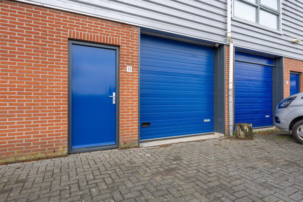 Entree middels een loopdeur en overhead deur, de begane grond is grotendeels ingedeeld als bedrijfsruimte met een klein stukje kantoor/kantineruimte.