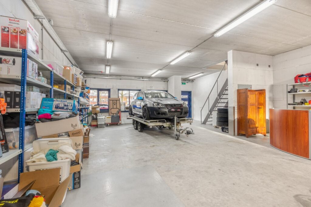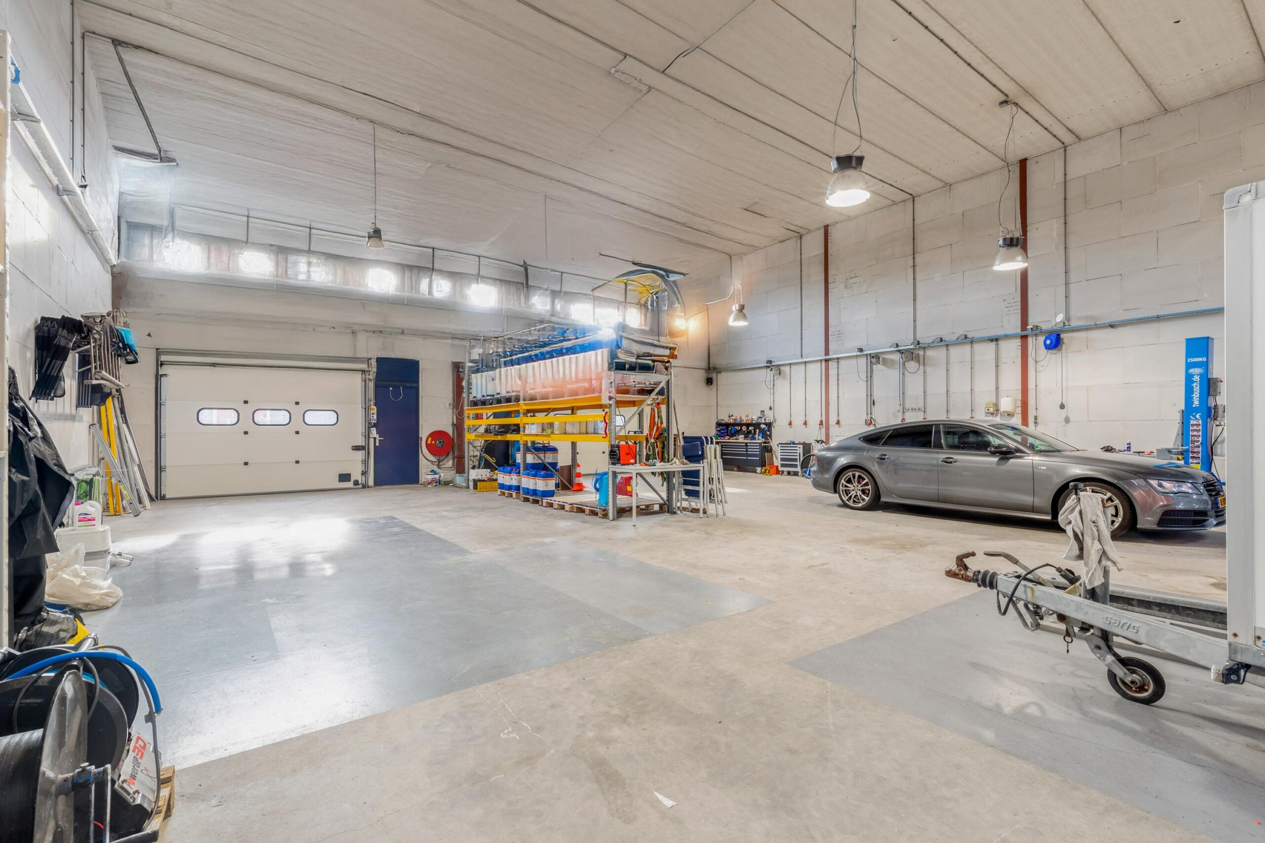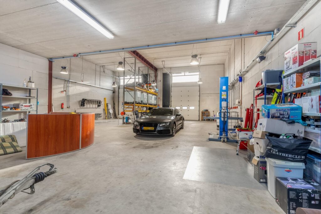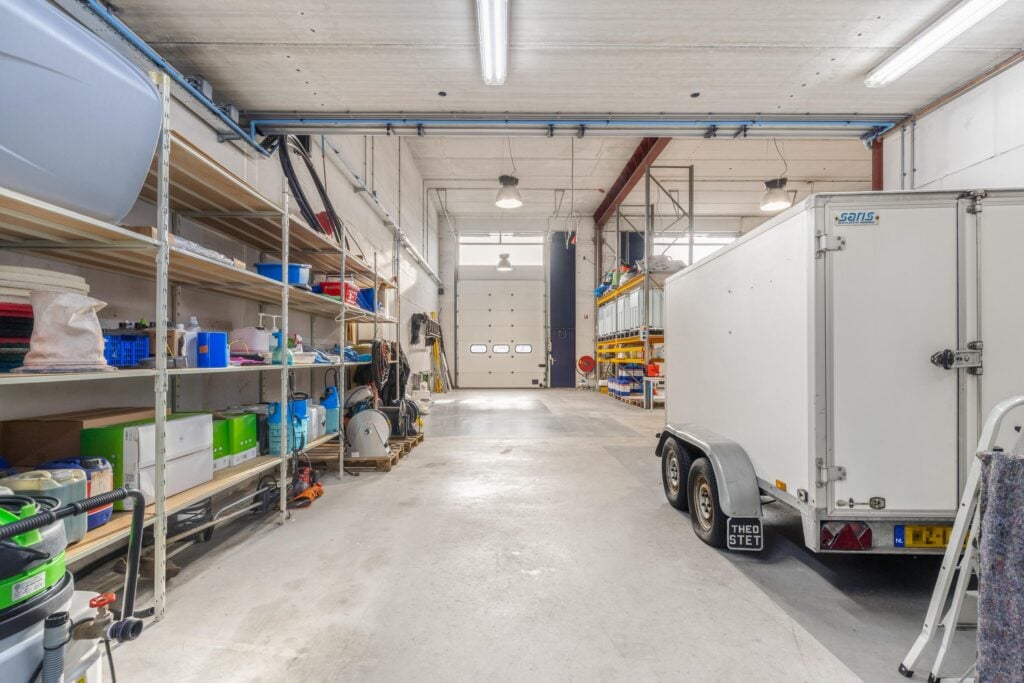Entree, meterkast, bedrijfsruimte met dubbele elektrische overheaddeur, toilet/urinoir en wastafel.