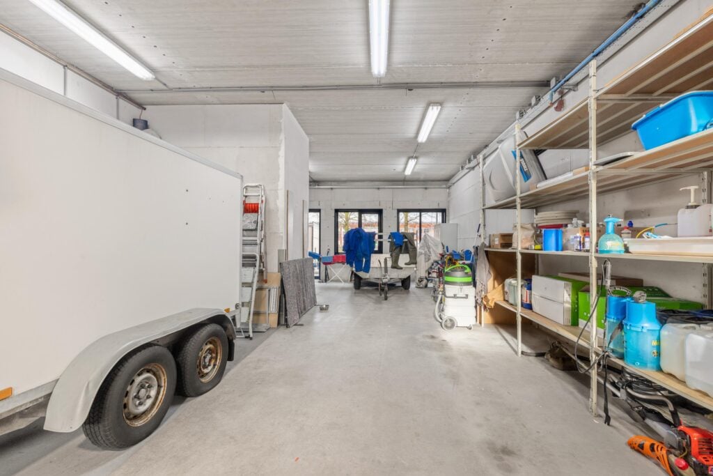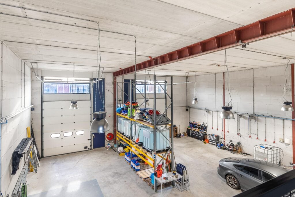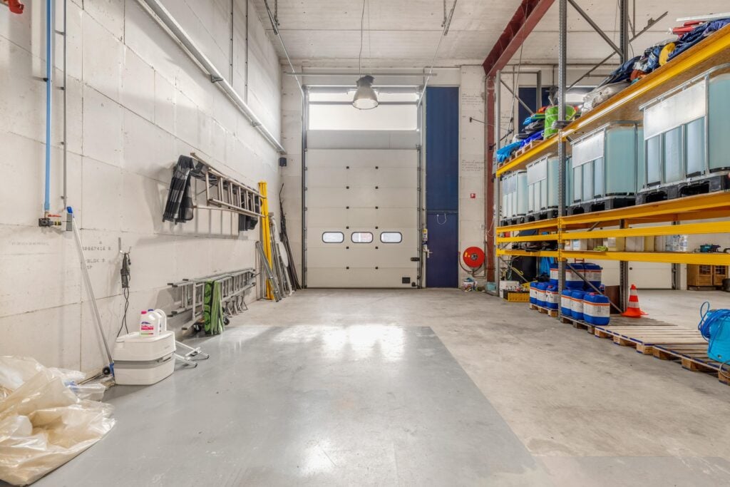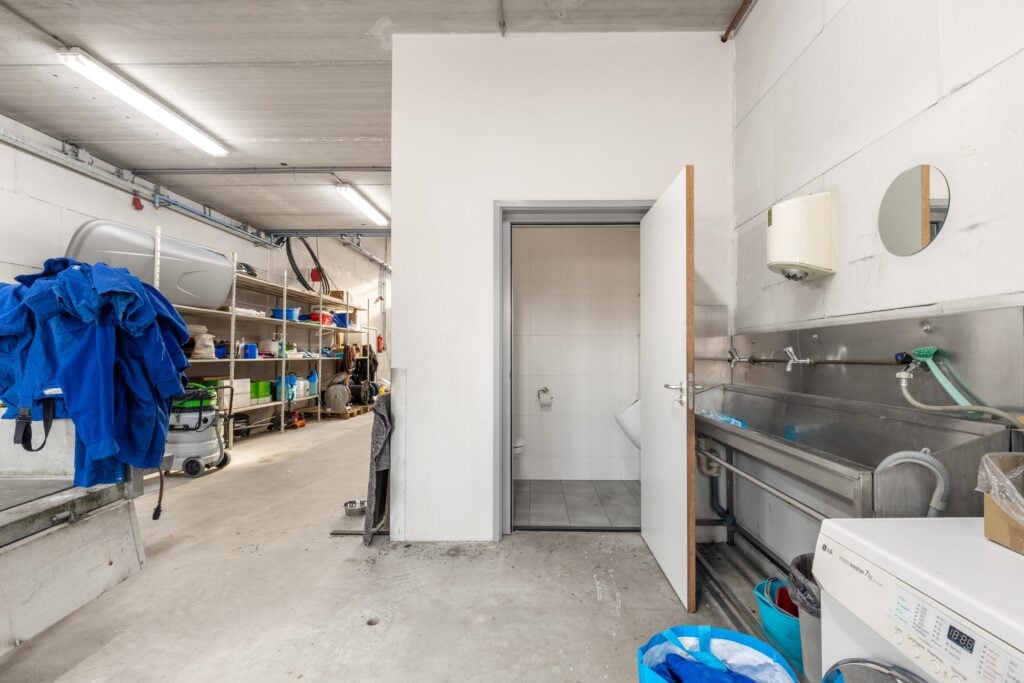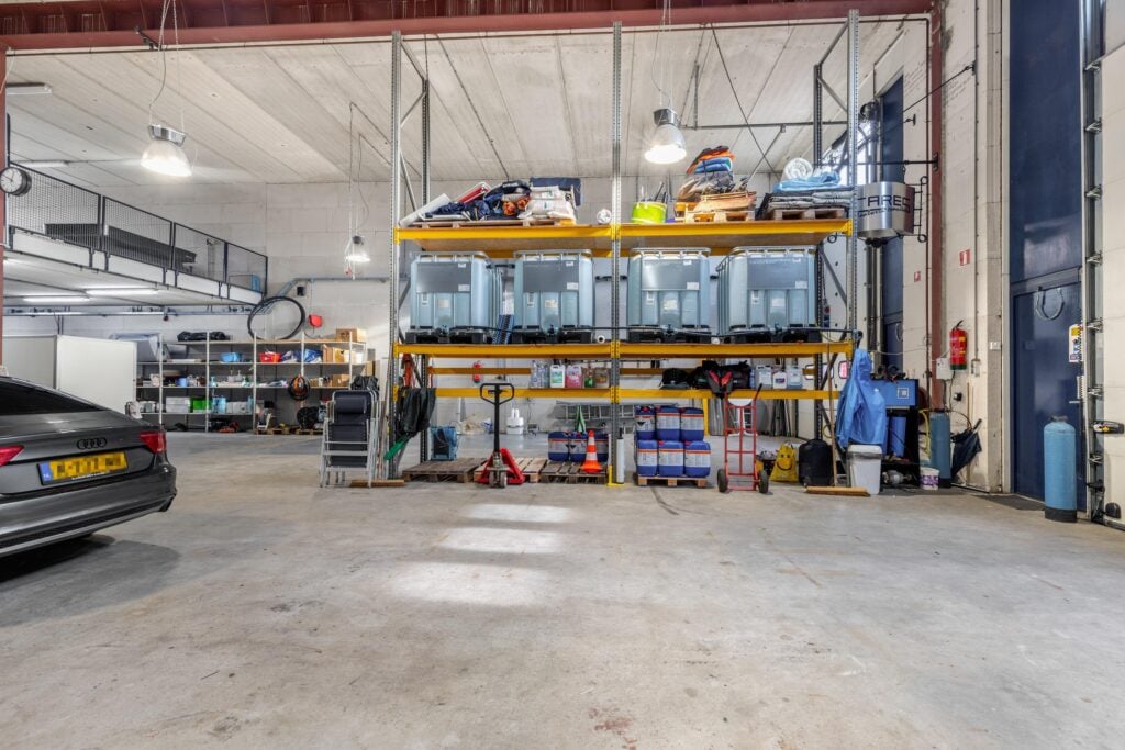 Entree, meterkast, bedrijfsruimte met dubbele elektrische overheaddeur, toilet/urinoir en wastafel.