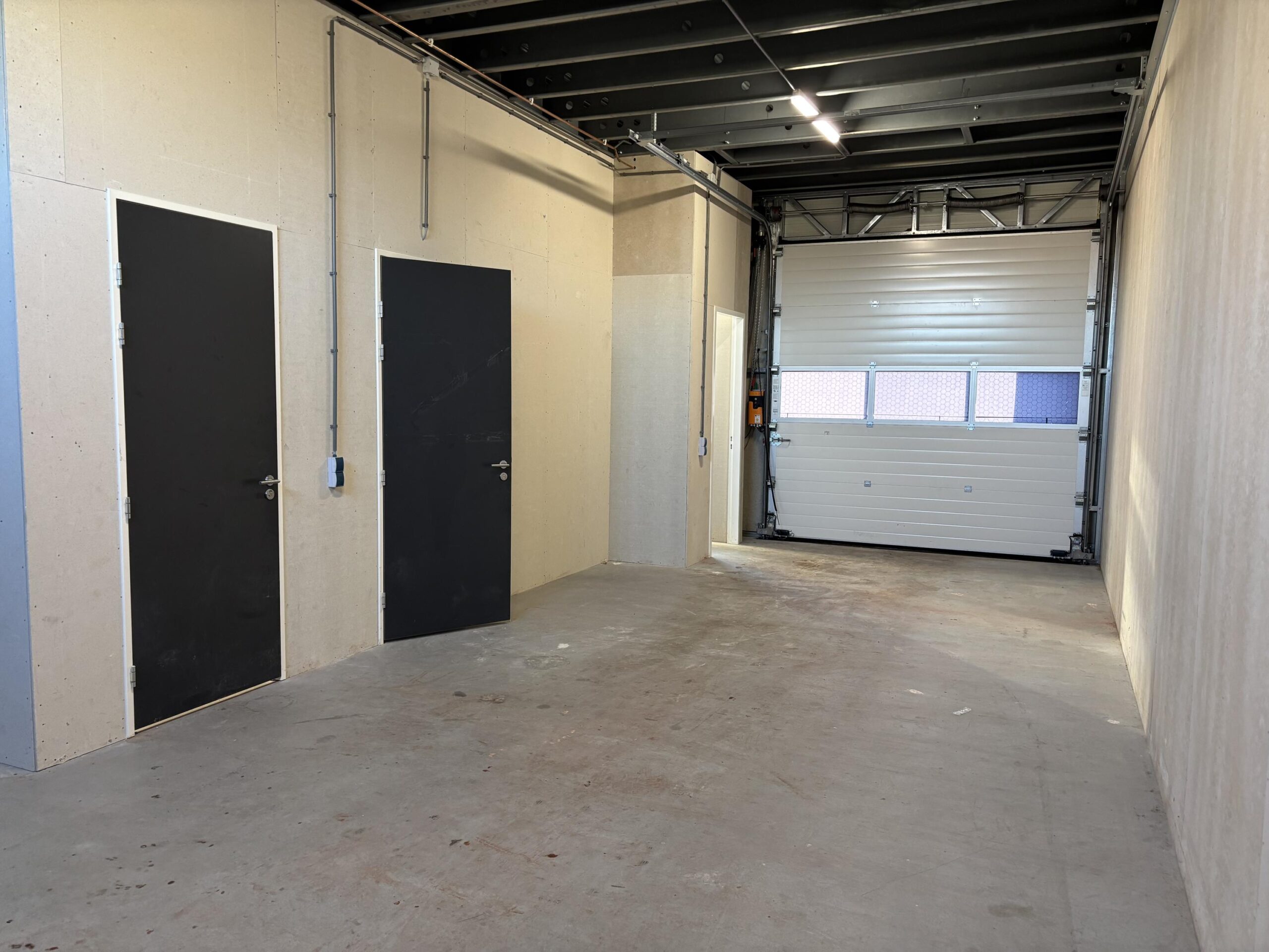 De ruimte is te betreden via de loopdeur aan de voorzijde of via de elektrische overheaddeur. Aan de rechterzijde is de trap naar de verdieping gesitueerd.
