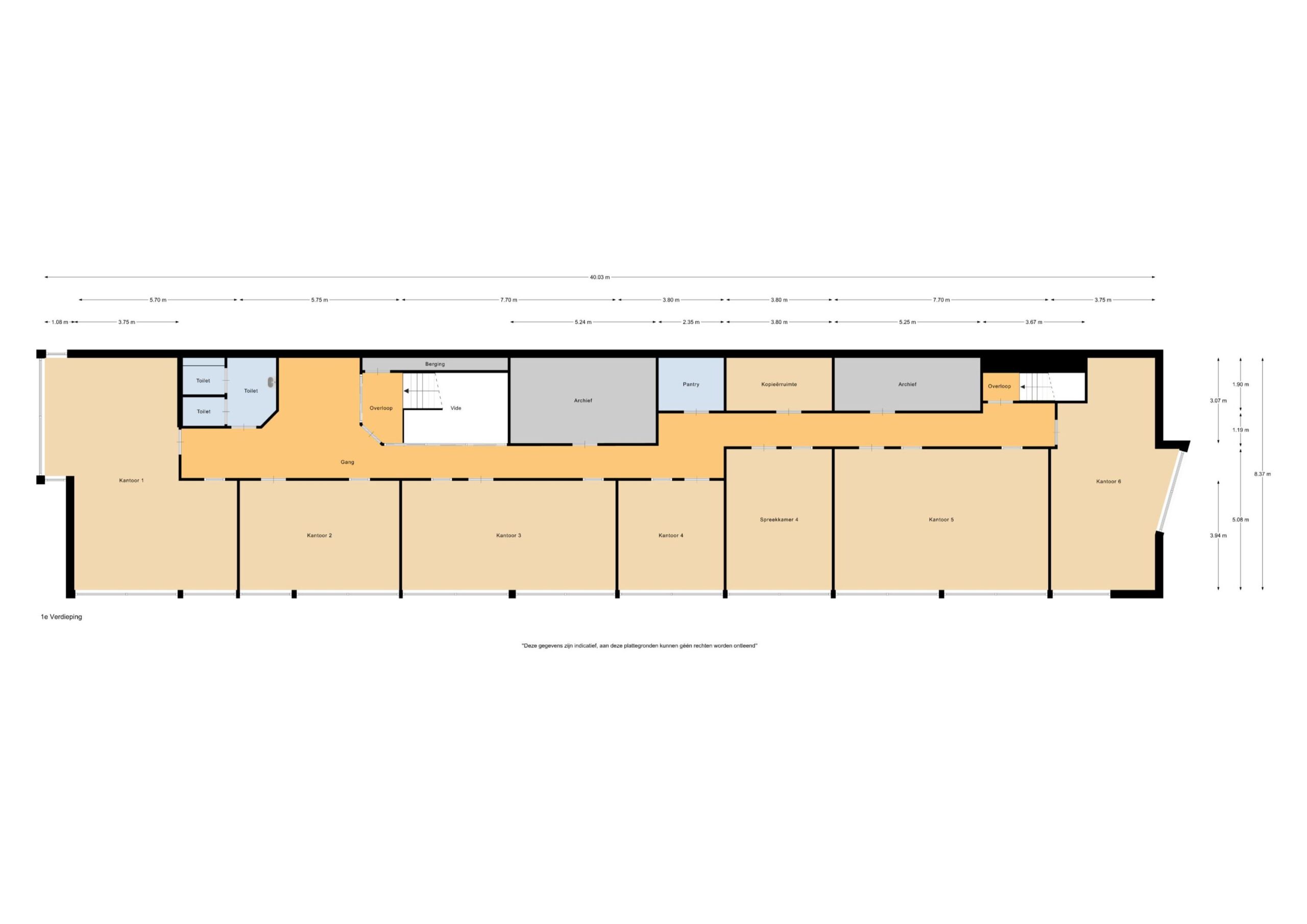1e verdieping: ontvangstruimte met toiletten. Gang met toegang naar kantoorkamer en gezamenlijke pantry.
