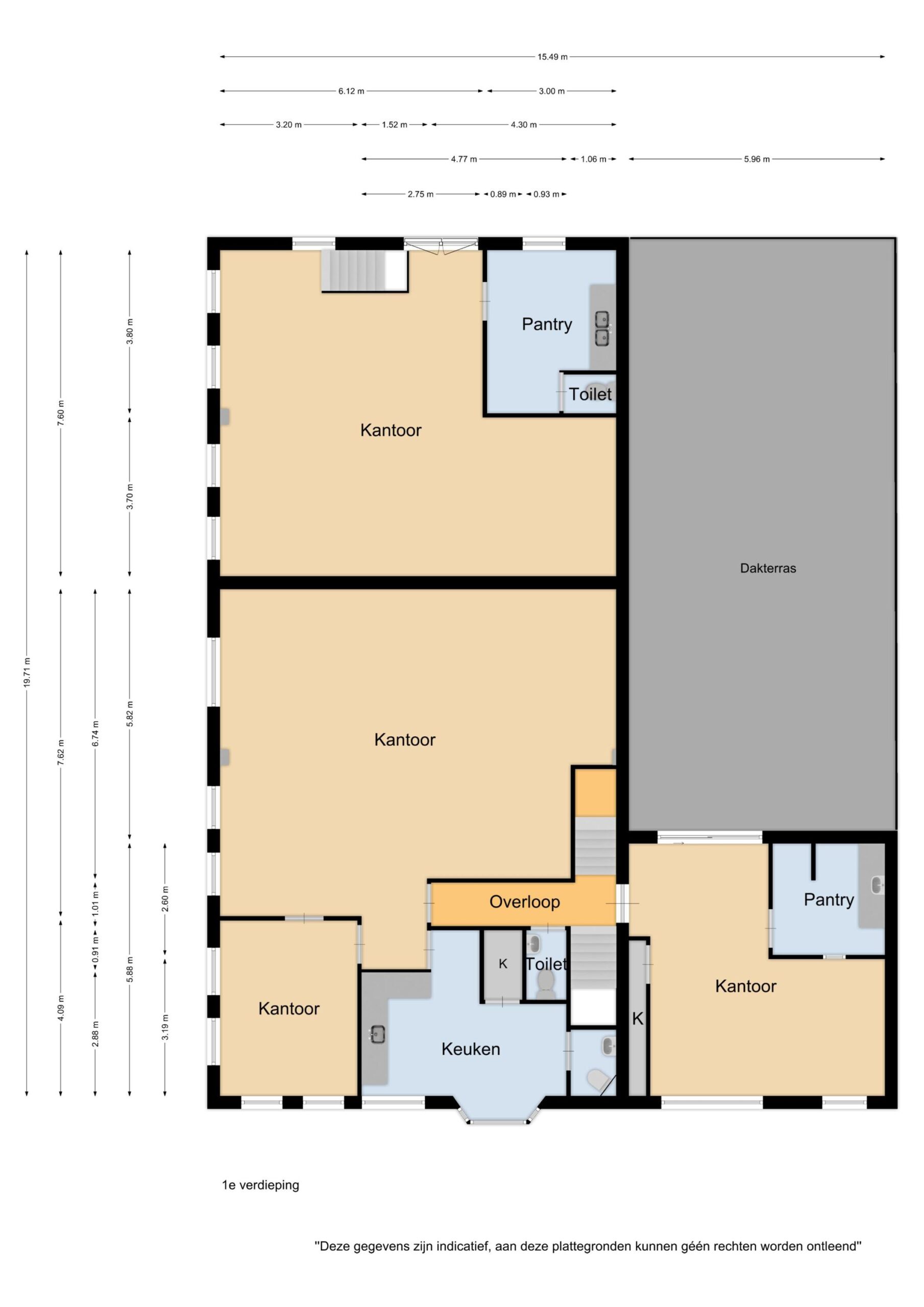 1e verdieping: 2 kantoorkamers, aparte keuken, douche en toilet.