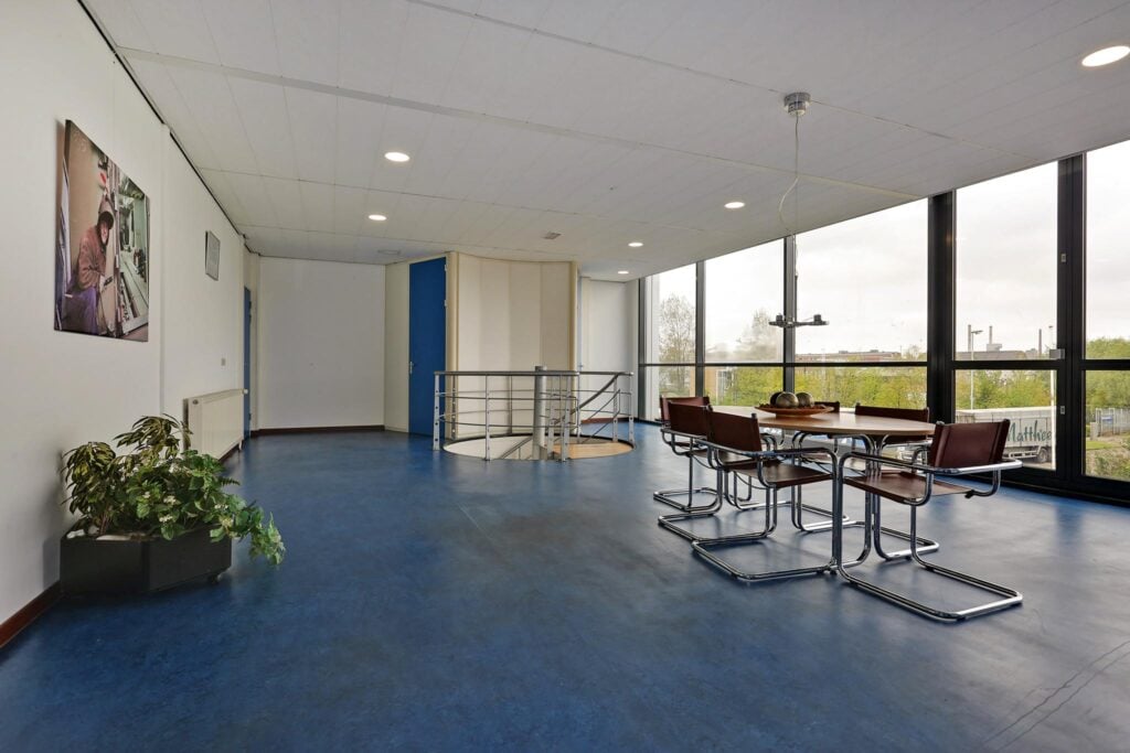 Centrale entree met trappenhuis, ontvangstruimte met toiletten. Gang met toegang naar de kantoorkamers.