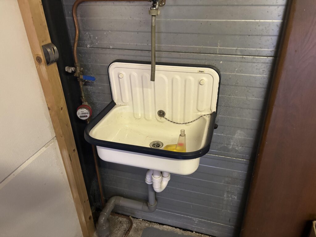 – uitstortgootsteen met water aftappunt aangesloten op vuilwaterriool